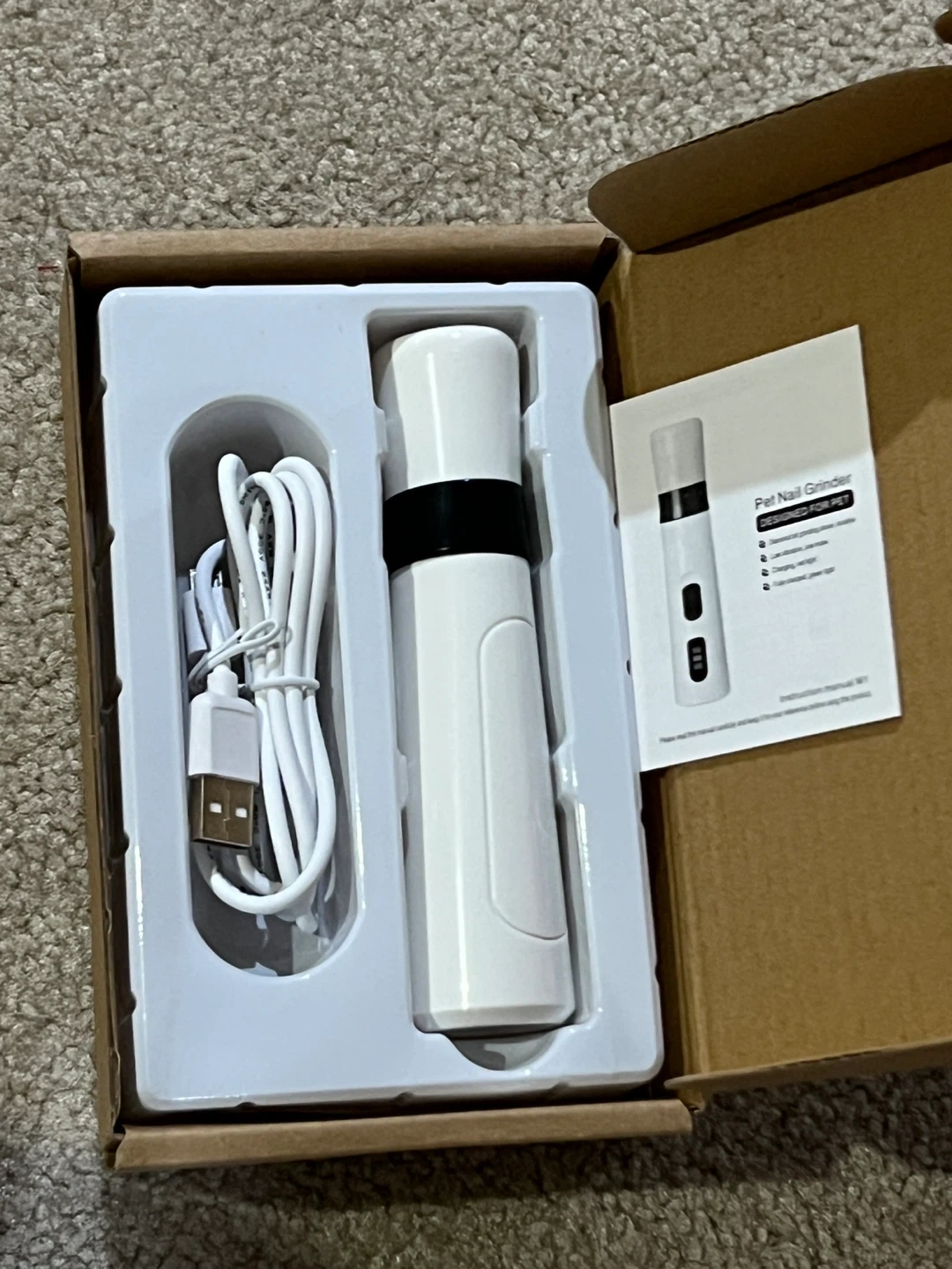 Selling a pet nail grinder that is brand new! It comes with its original box and includes a USB charging cable and instructions. It features USB charging, a detachable grinding wheel, low vibration, low noise, and cordless operation, making it super convenient for pet grooming!