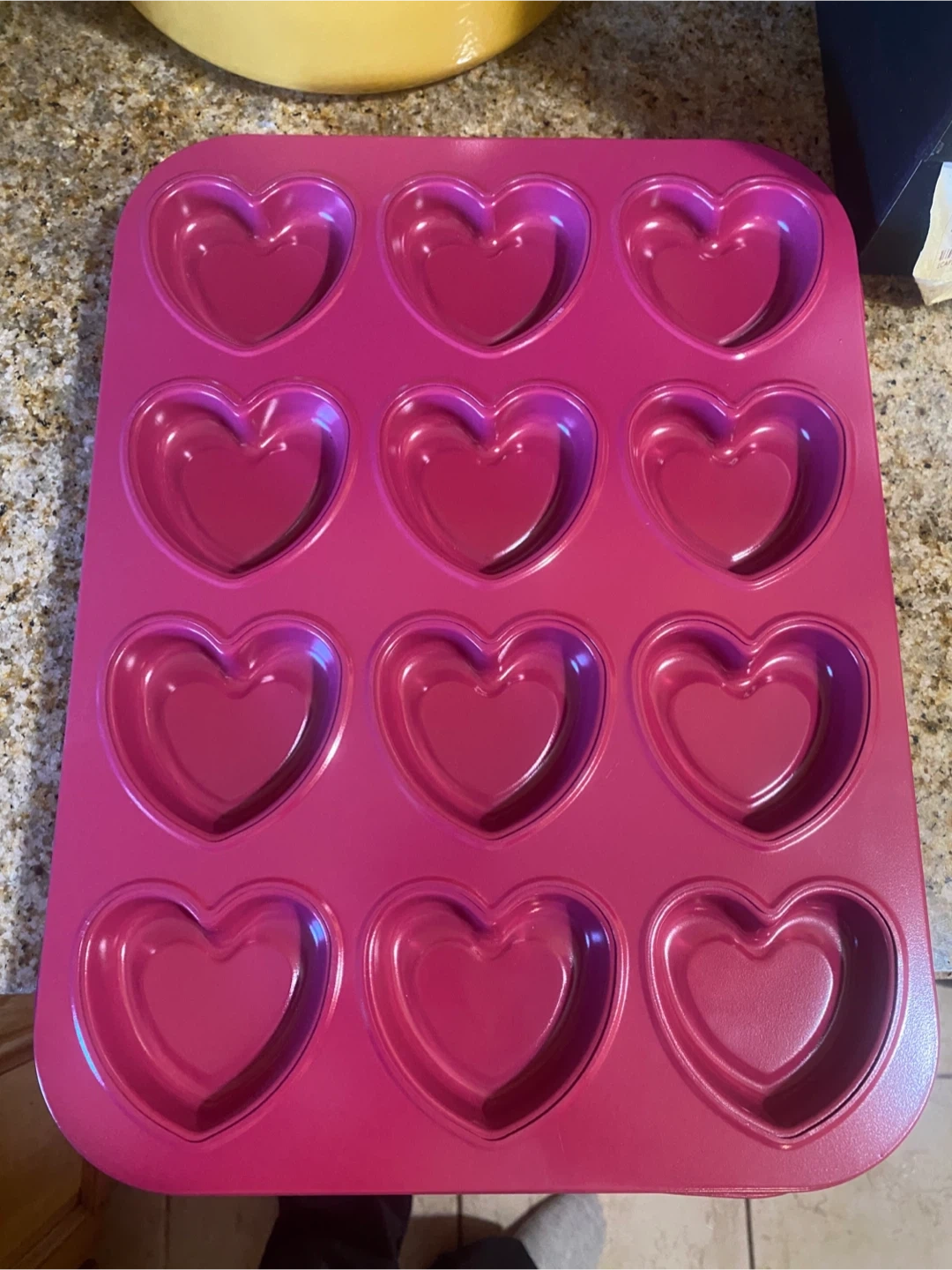 I'm selling a heart-shaped muffin tin in a lovely pink color! It features 12 heart-shaped molds, perfect for baking treats for loved ones or special occasions. It's in great condition and ready for a new home!