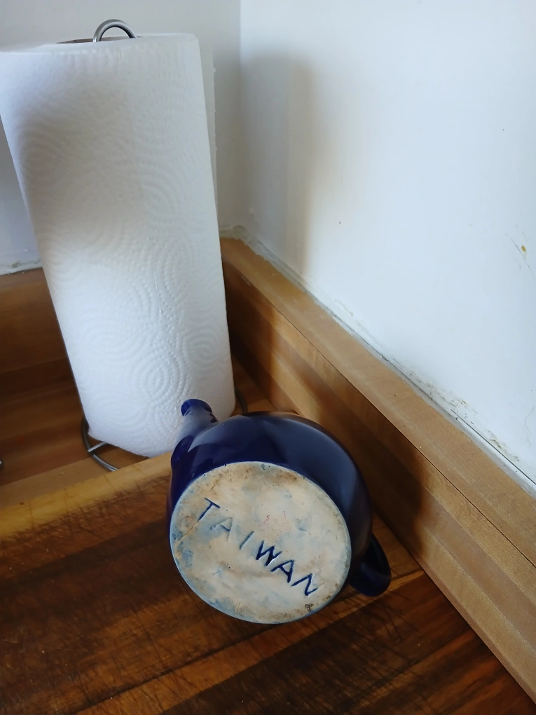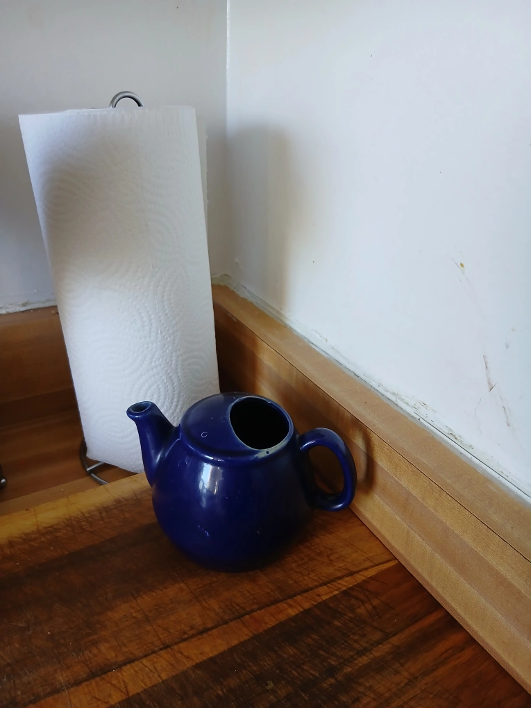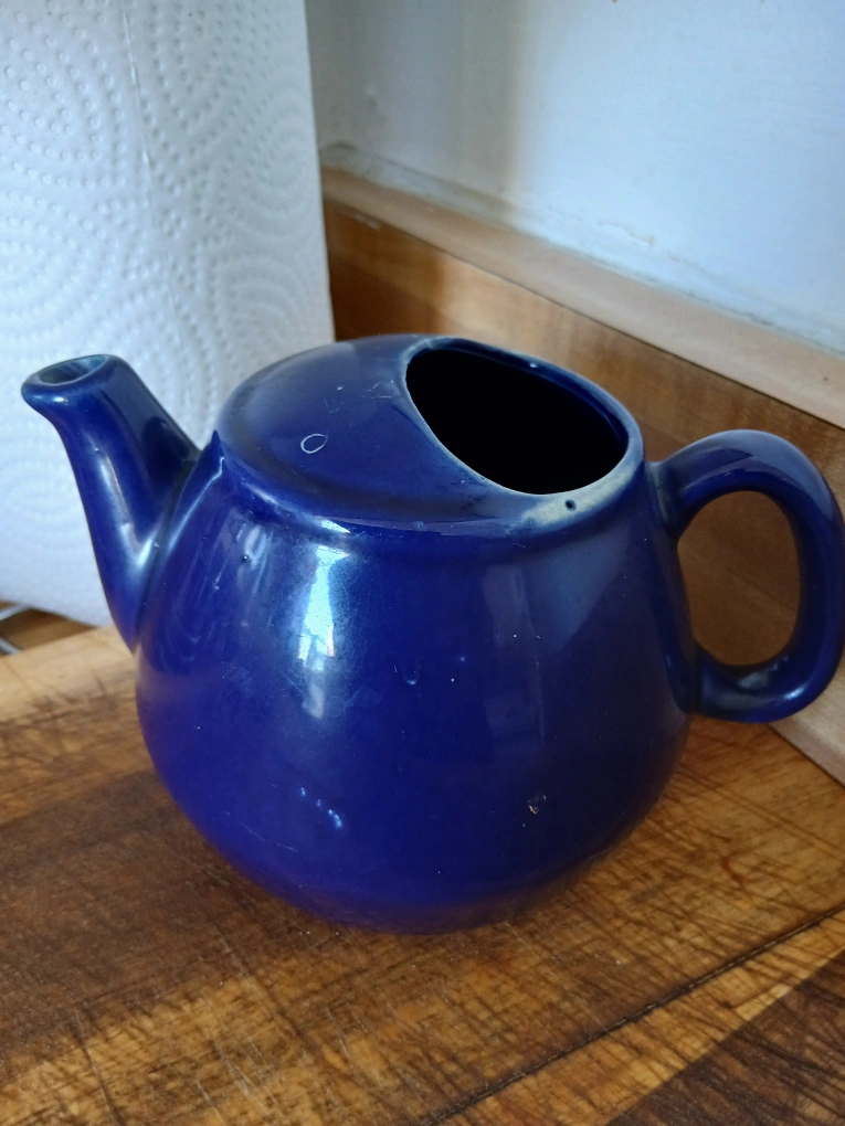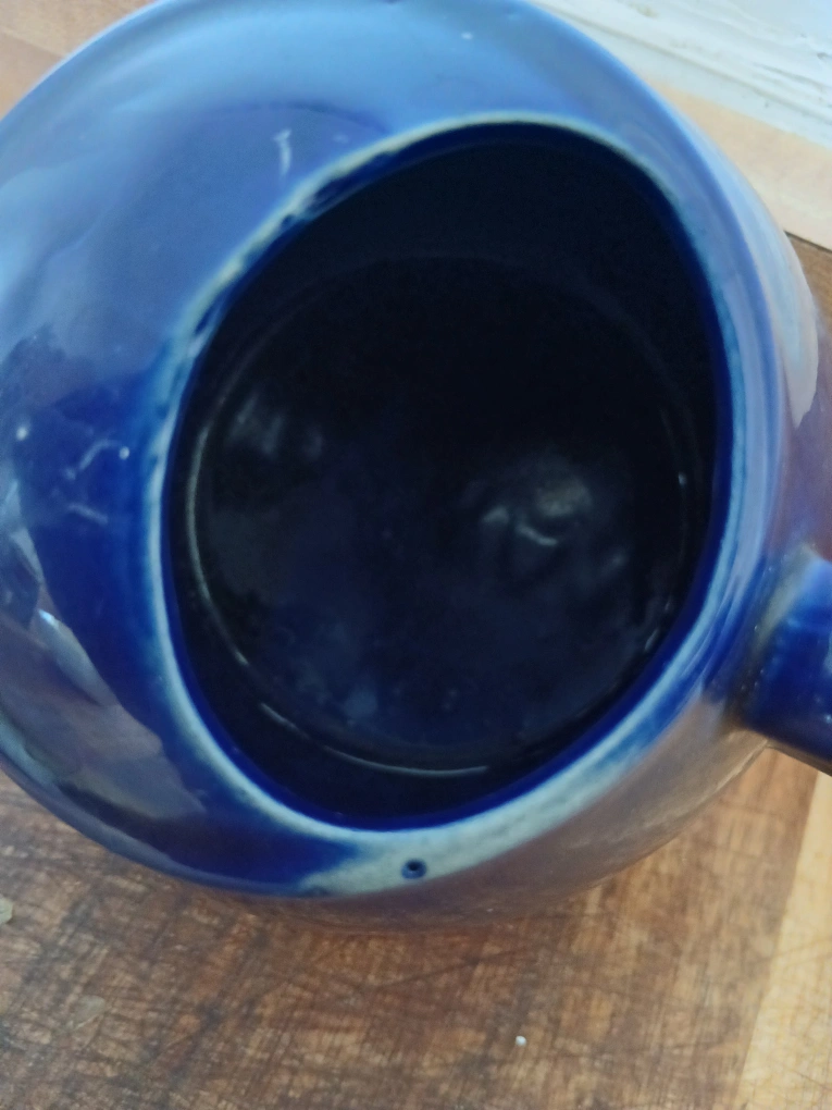 A cute blue ceramic teapot, perfect for pouring milk or tea! Made in Taiwan... labeled on the bottom. Use for Hot or cold... its been tried and true.