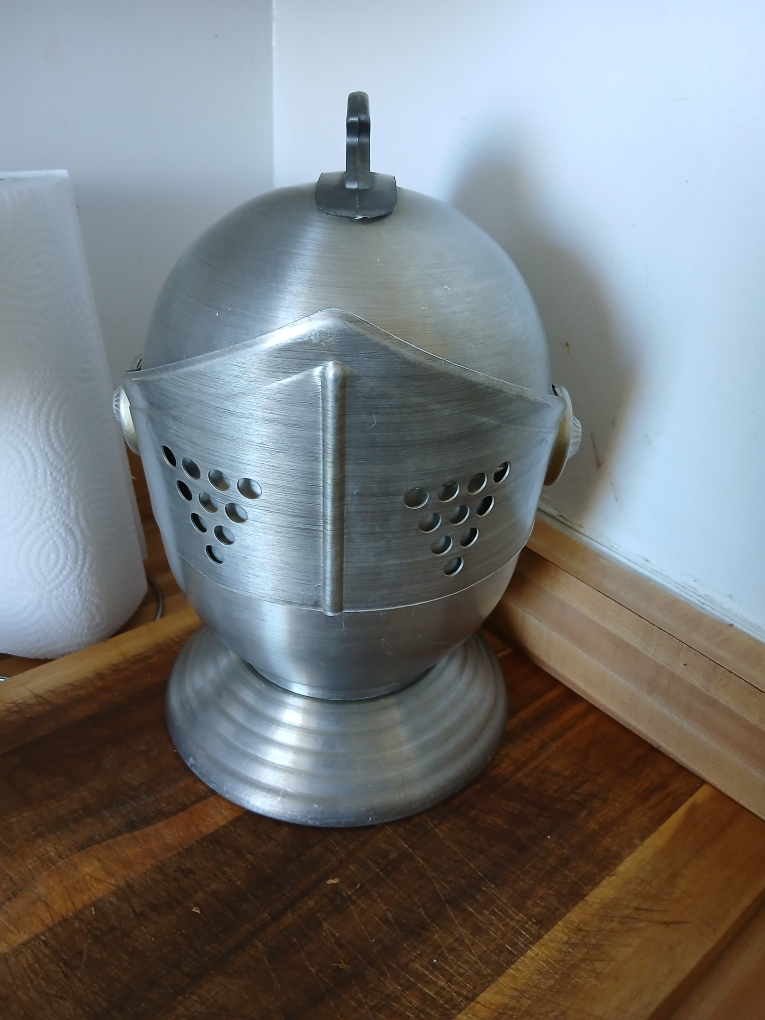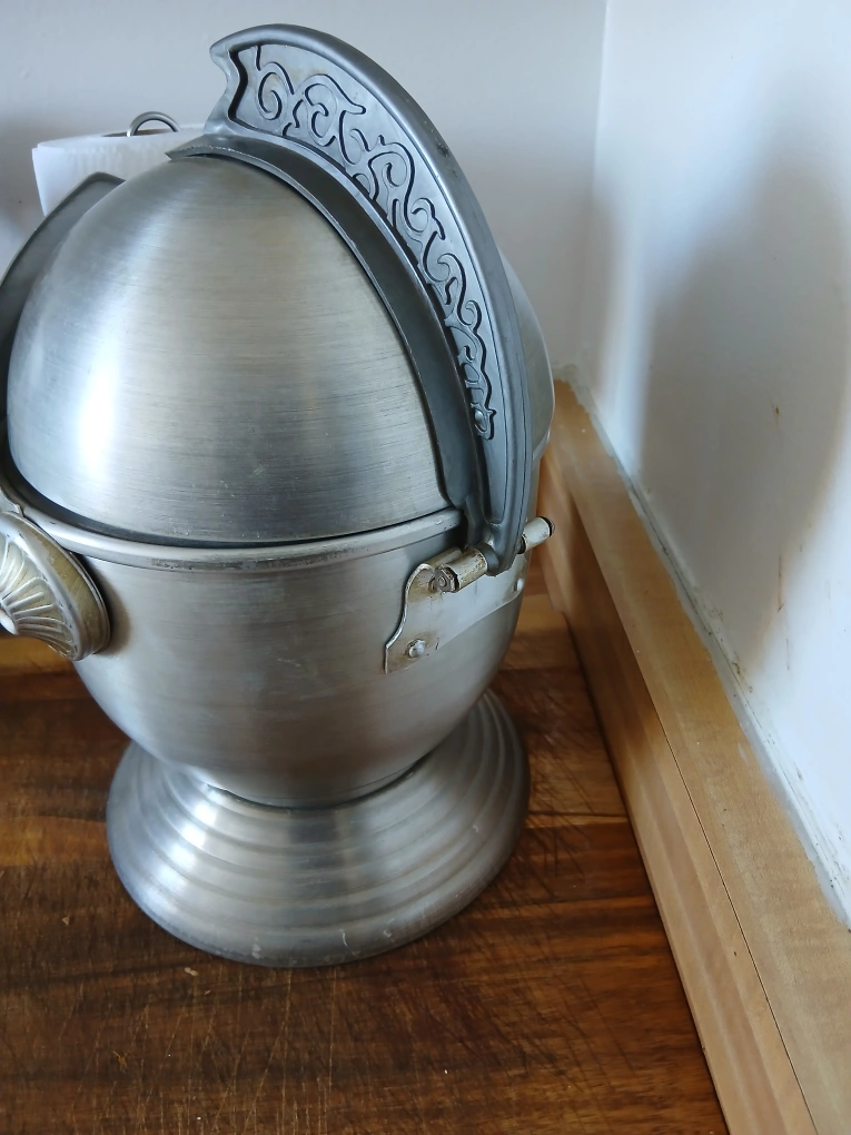 Selling a unique silver ice bucket! It's in great condition and ready to keep ice or your drinks cool. The design is really eye-catching, almost like a knight's helmet. Perfect for parties or just adding a bit of flair to your home bar.
