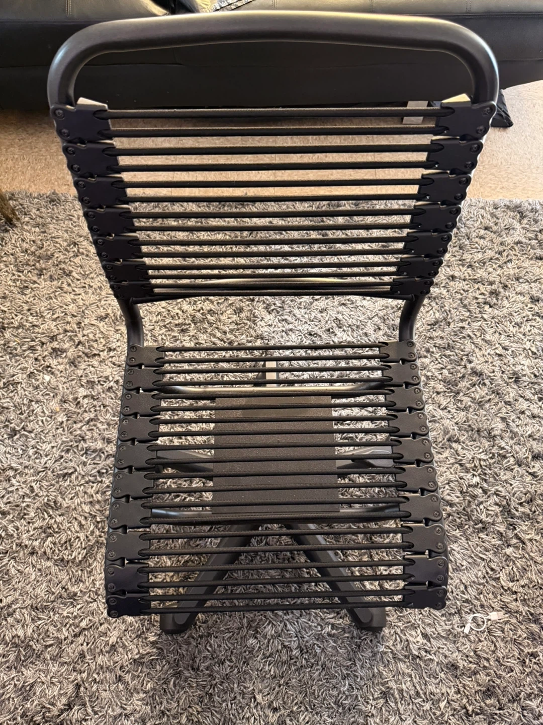 Selling a Vari task chair in black! This chair is in great condition and ready to provide comfortable support for your workspace. It features a unique design with flexible slats for the back and seat, and it's on wheels for easy movement.