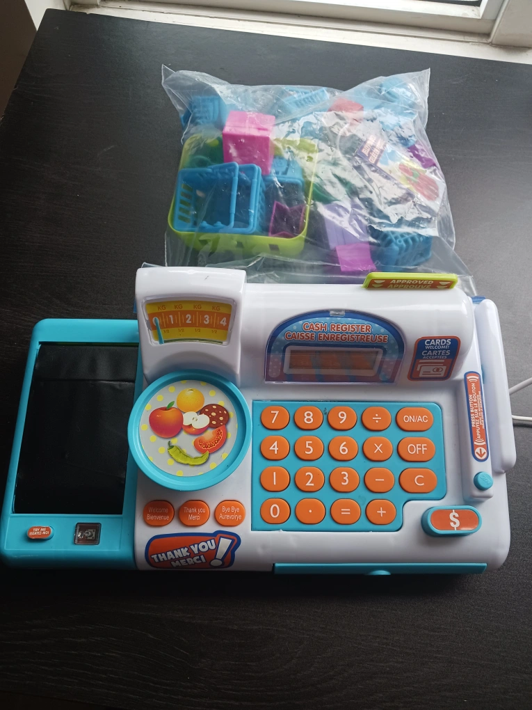 1000+Selling a toy cash register that's perfect for kids who love to play pretend store! It comes with a bunch of colourful accessories, including mini shopping baskets and play food items. The register has buttons and a screen to make the play experience even more realistic. Great for hours of fun!