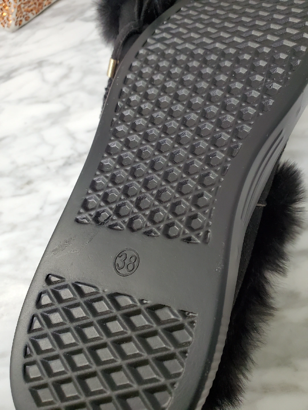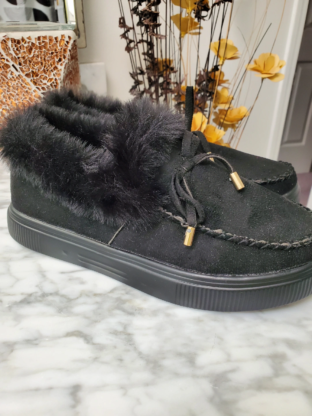 Cute and comfy black moccasin slippers with furry trim! They are a European size 38, which is approximately a US size 7.5. Perfect for keeping your feet warm and stylish around the house