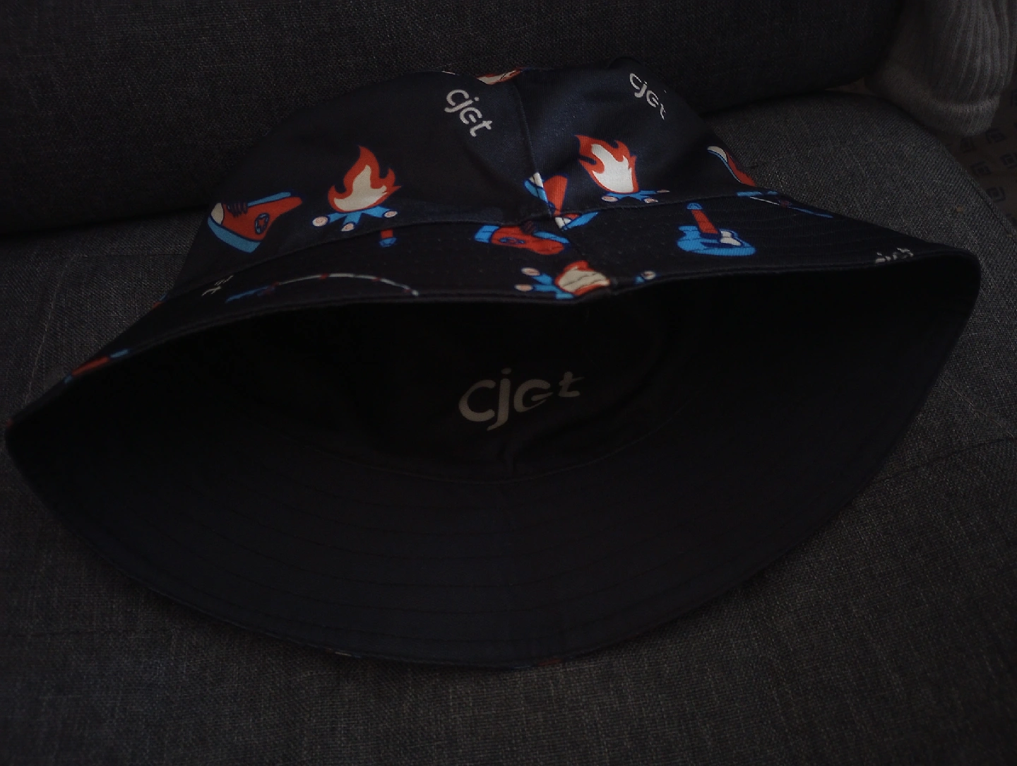 Looking to add a fun accessory to your wardrobe? This cjet bucket hat features a playful campfire design with fishing rods, guitars, and campfires. It's perfect for outdoor adventures or just adding a touch of whimsy to your everyday look! The hat is in great condition and ready for a new home