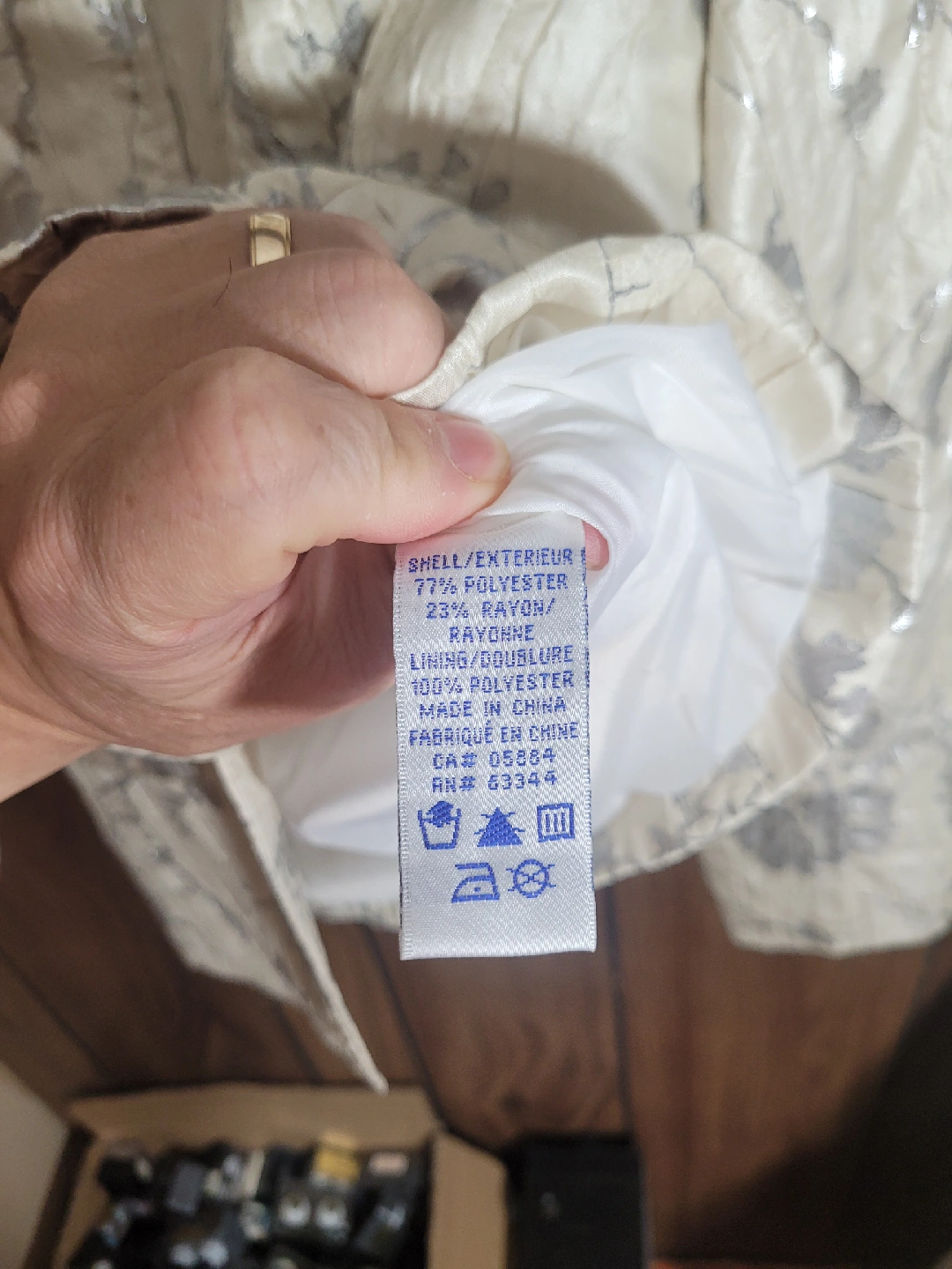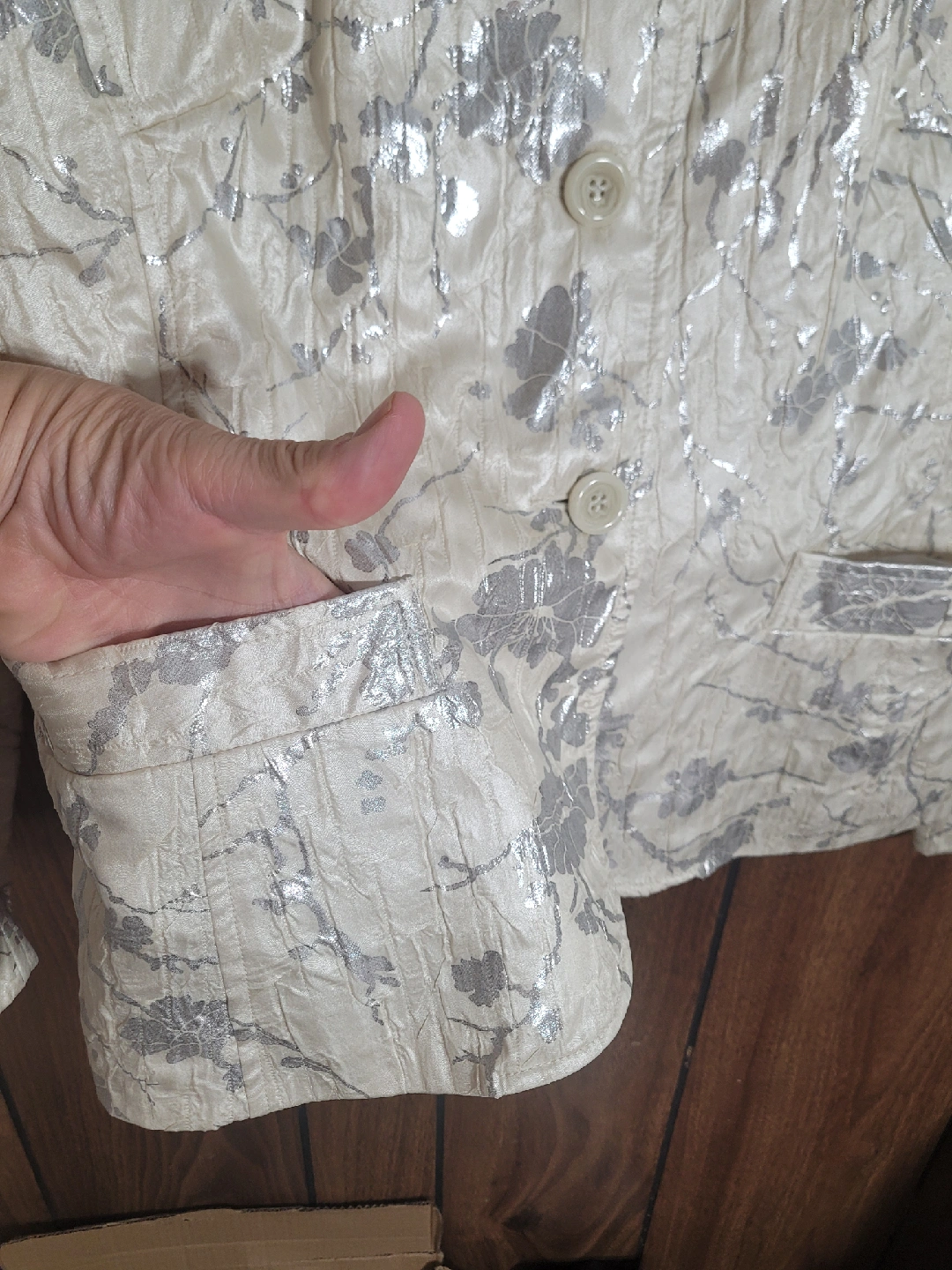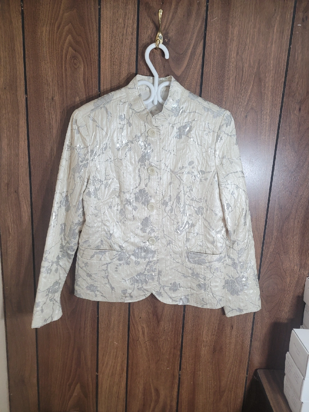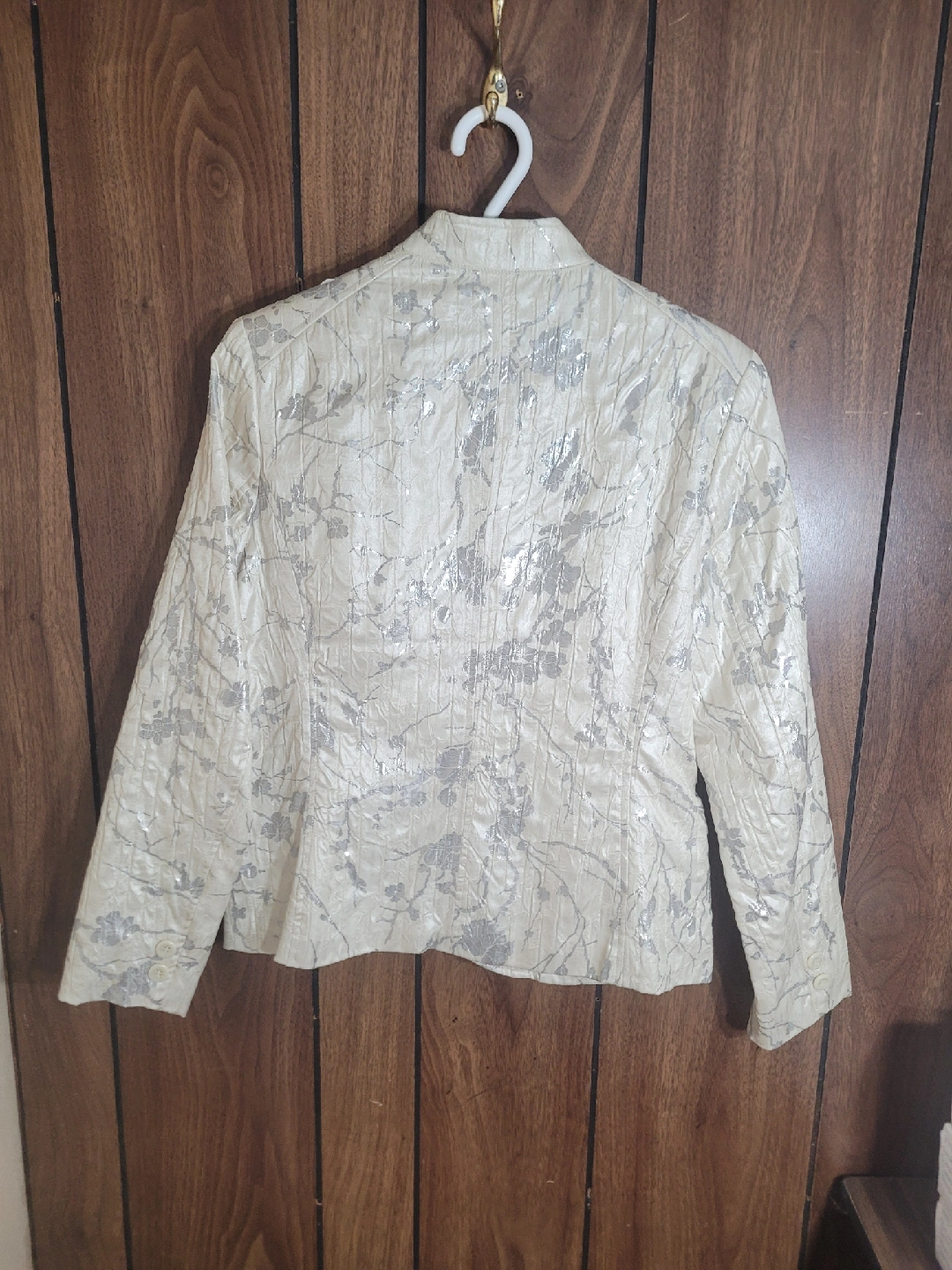 197This is a gorgeous TABI Simply Classic blazer in a size M! It's a beautiful winter white colour with a subtle silver floral pattern. The blazer is in great condition and originally retailed for $109. It's perfect for adding a touch of elegance to any outfit!