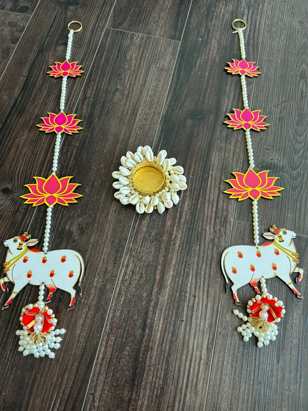 Cute Indian style hanging decorations! Includes two strands with lotus and cow designs, plus a candle holder with shell accents