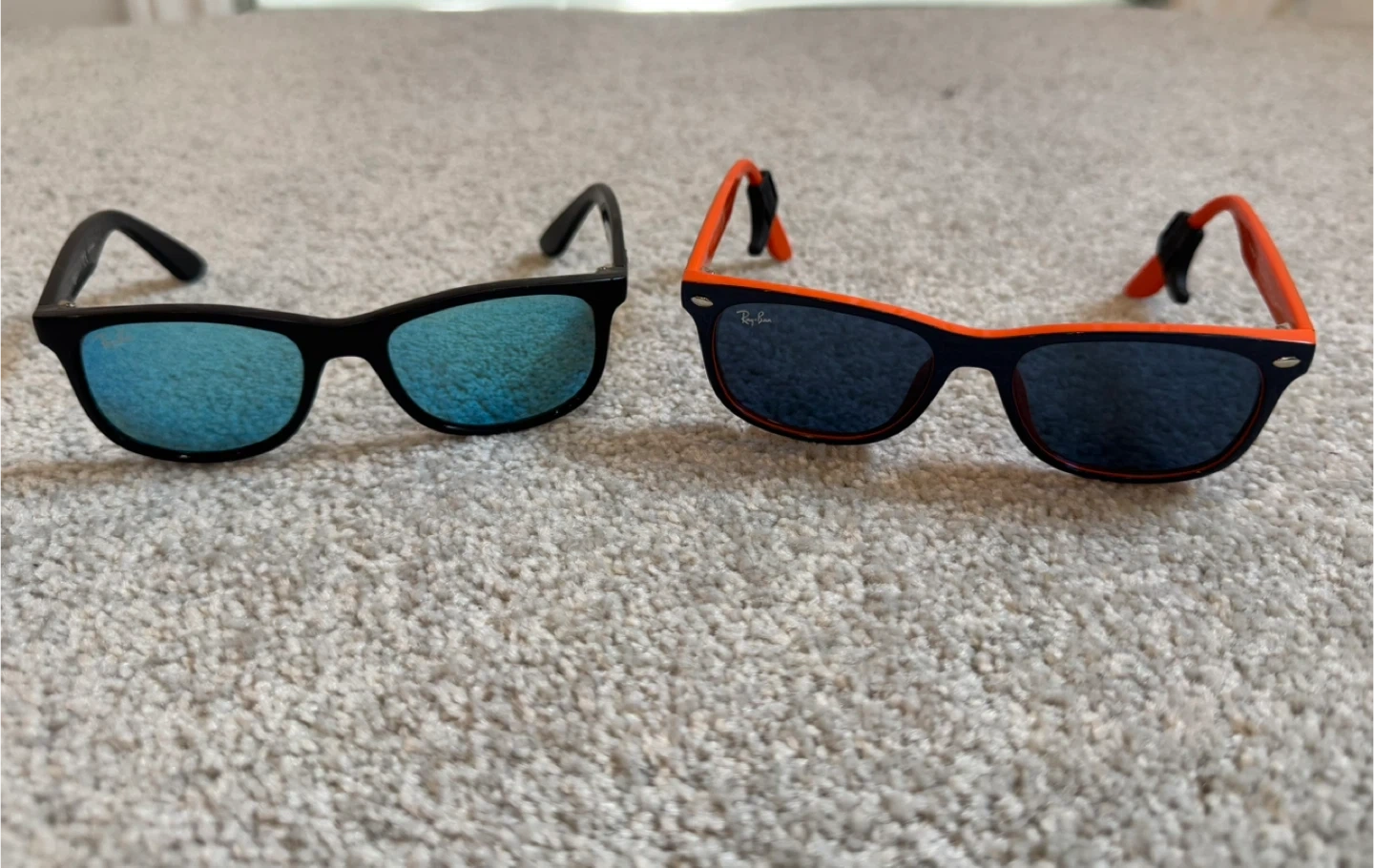 Two pairs of Ray-Ban sunglasses for sale! One pair is black with blue lenses, the other is orange with dark lenses. Both are gently used and in great condition. These retail for $110. I am selling it for $50 each or buy both for $80.