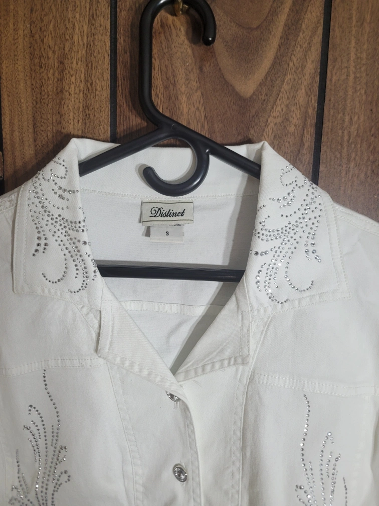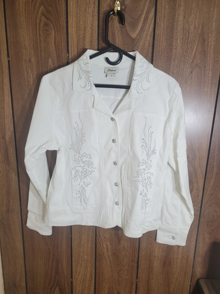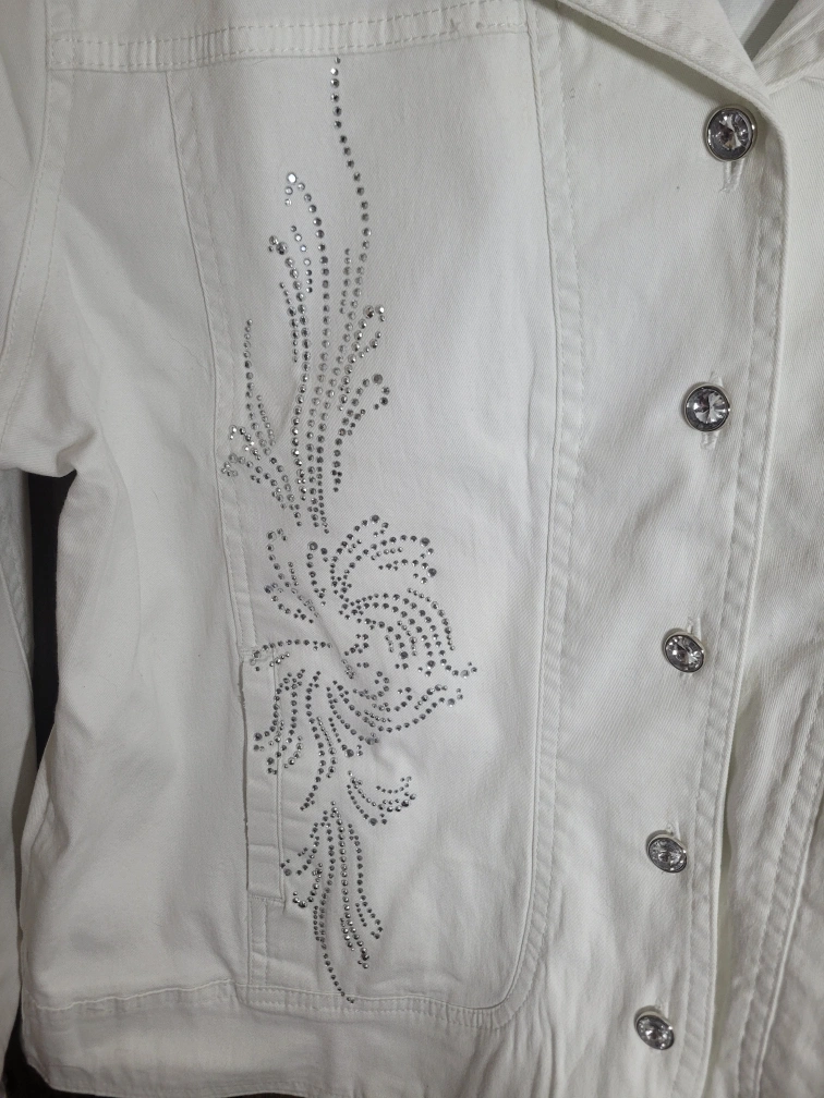 Selling a gently used Distinct denim jacket in size small. It's a crisp white colour with beautiful embellishments on the front, collar, and sleeves. The material is a comfortable blend of 95% cotton and 5% spandex, offering a bit of stretch. Perfect for adding a touch of sparkle to your outfit!