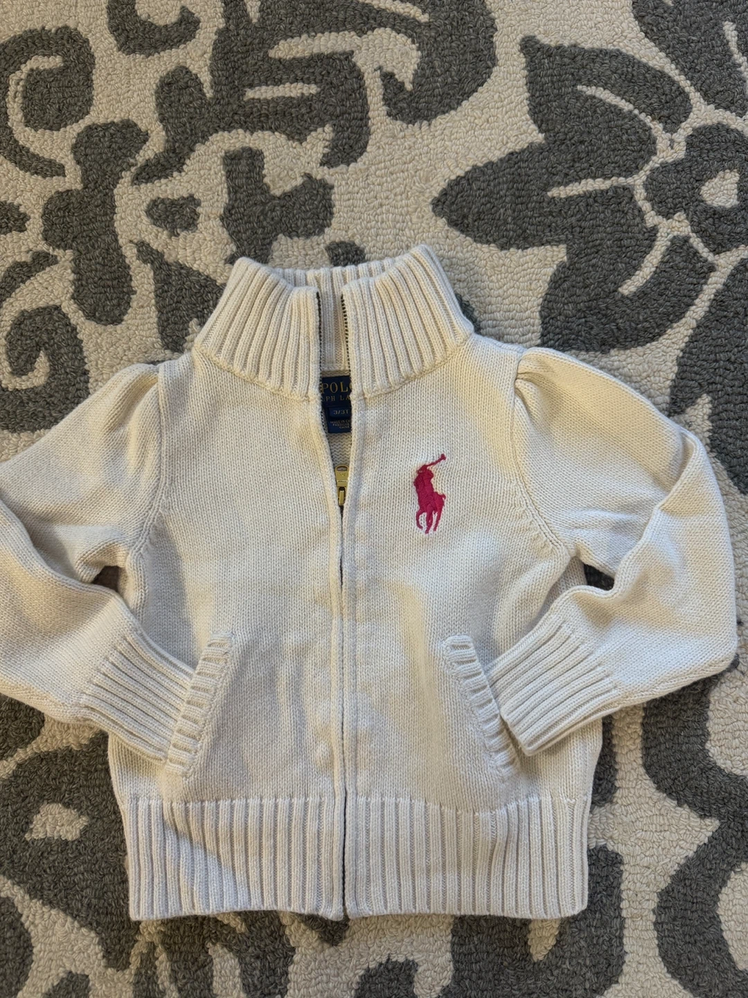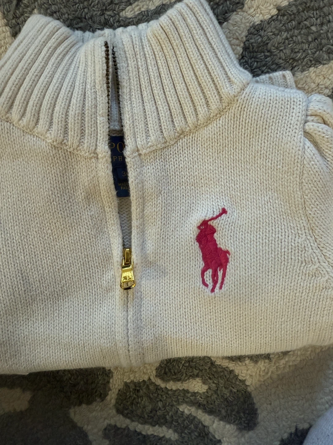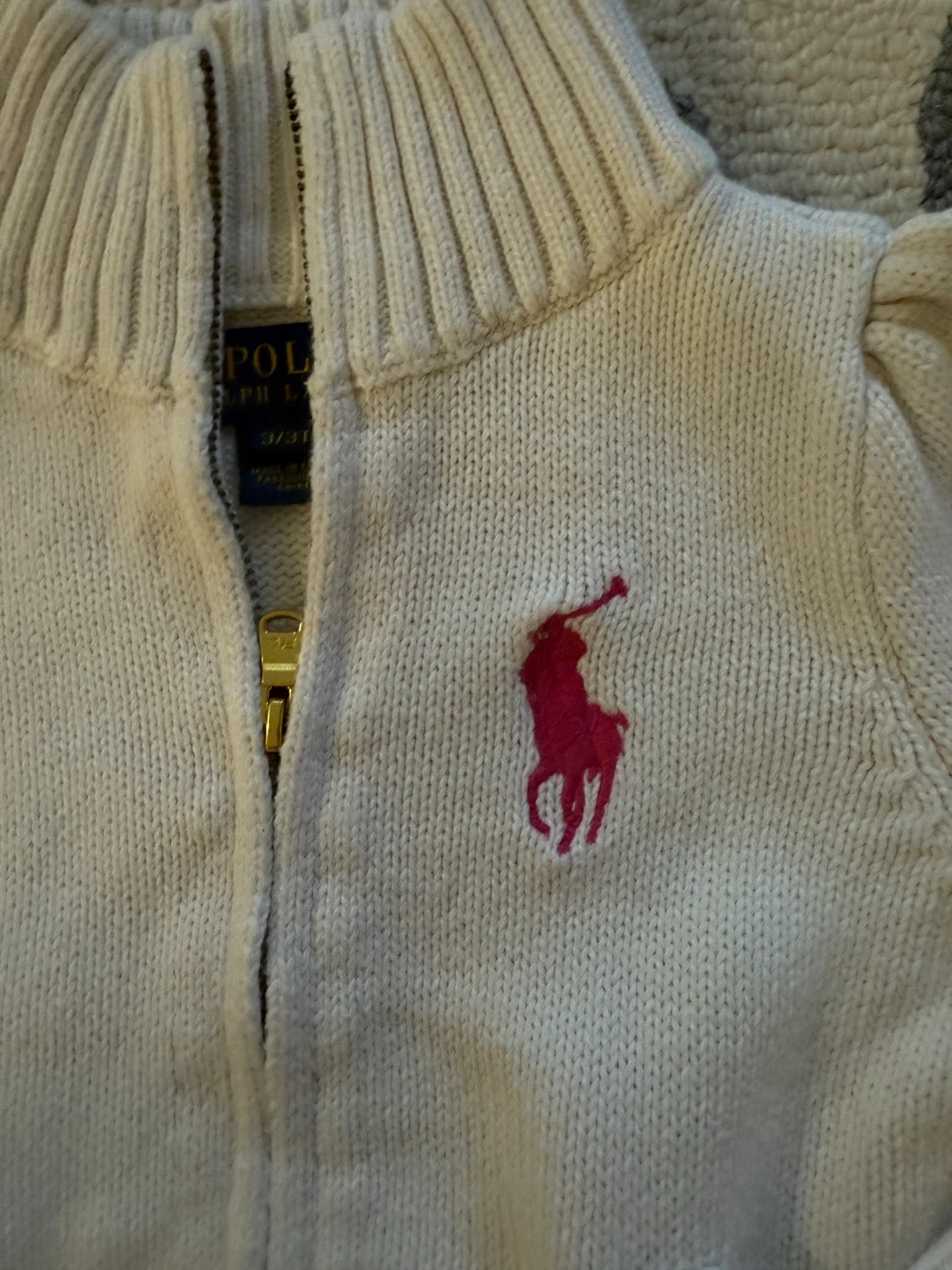 157Selling a cute Ralph Lauren knit zip-up sweater for toddlers! It's in excellent condition and a lovely cream colour. The size is 3/3T and features the classic Ralph Lauren logo in pink. Perfect for keeping your little one warm and stylish!