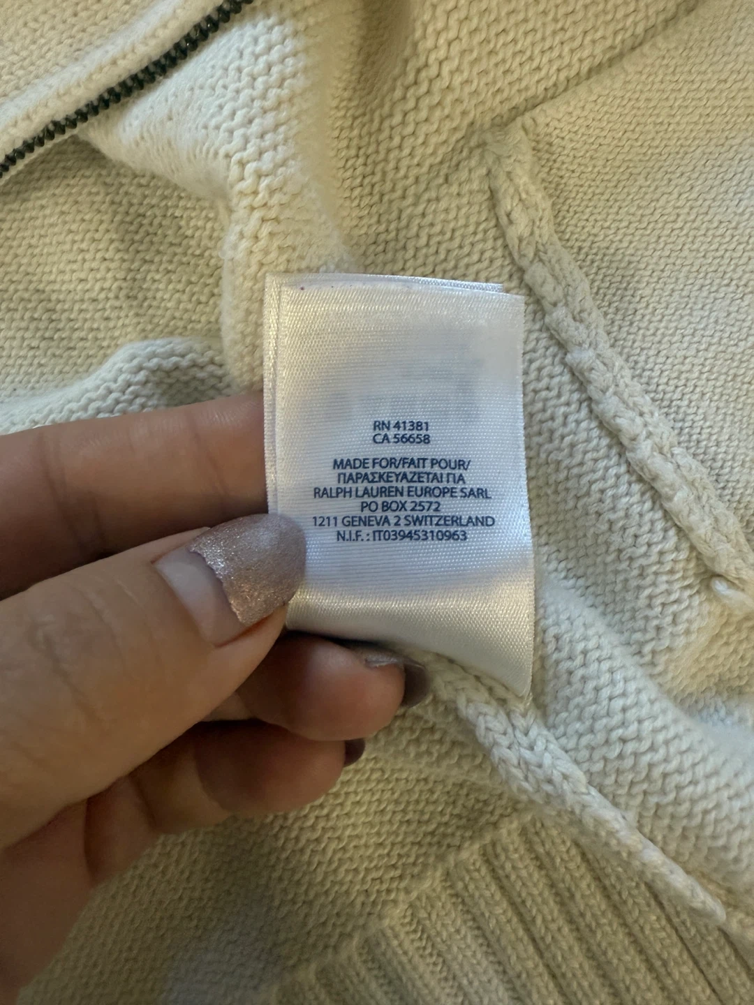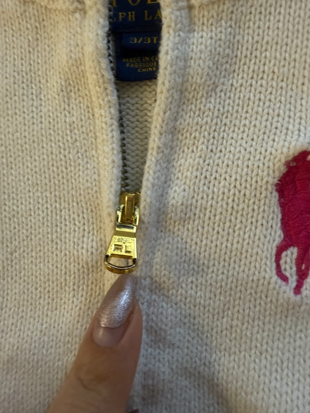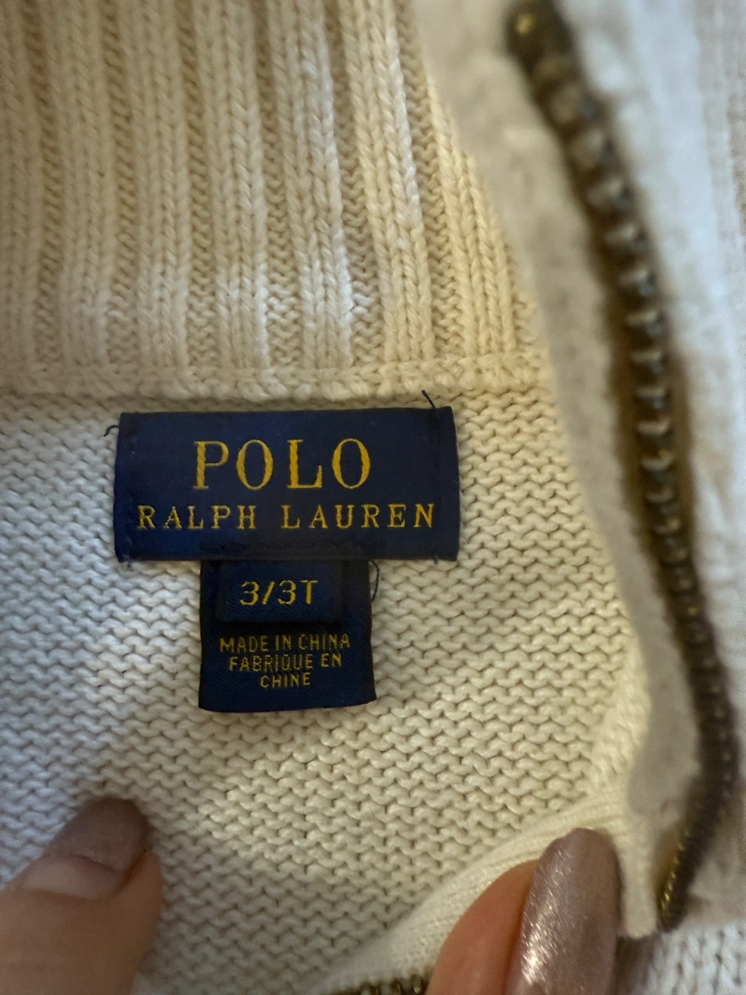157Selling a cute Ralph Lauren knit zip-up sweater for toddlers! It's in excellent condition and a lovely cream colour. The size is 3/3T and features the classic Ralph Lauren logo in pink. Perfect for keeping your little one warm and stylish!