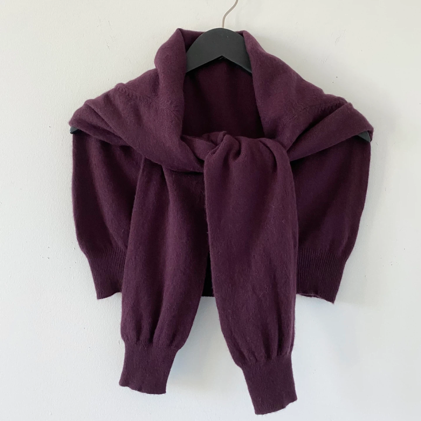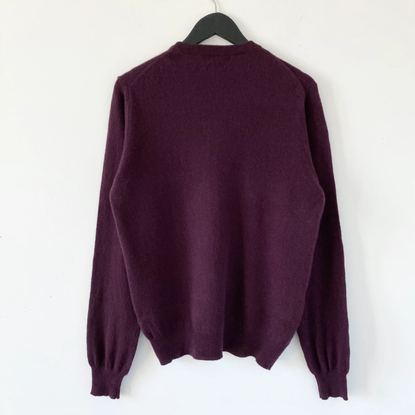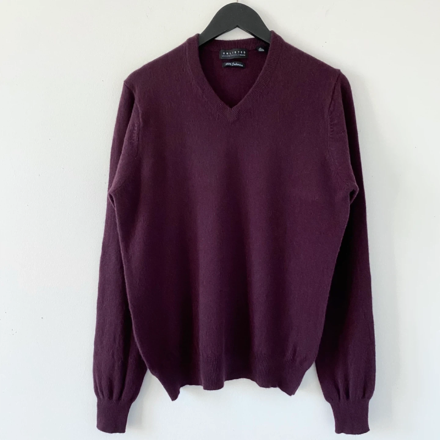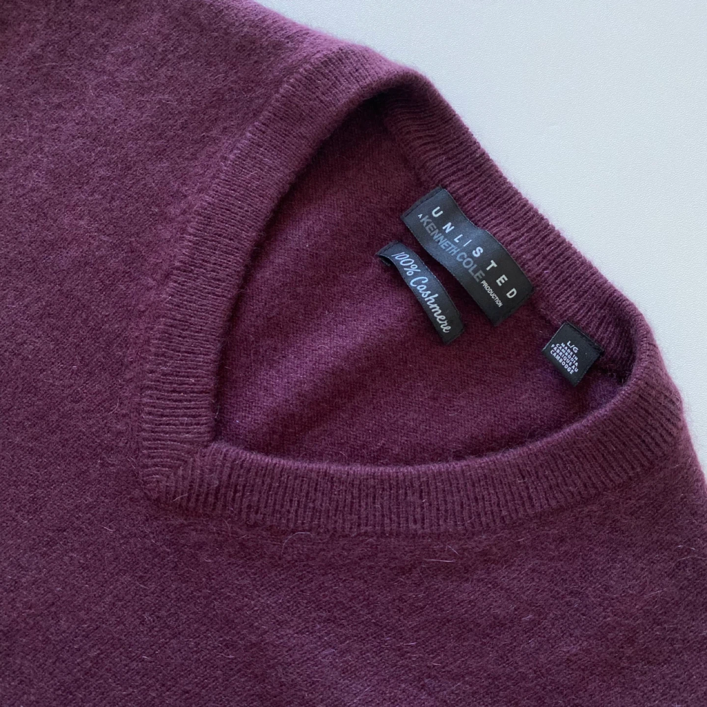 Kenneth Cole v-neck sweater. Made of light to medium weight 100% cashmere in a rich burgundy colour. It's incredibly soft, cozy and luxe. I don't find it itchy but it's subjective. This classic style and quality will stand the test of time and offer many ways to style. Love wrapping it around the neck or draping it over the shoulder. There's no staining, snags or damage. It's clean and in excellent condition.
