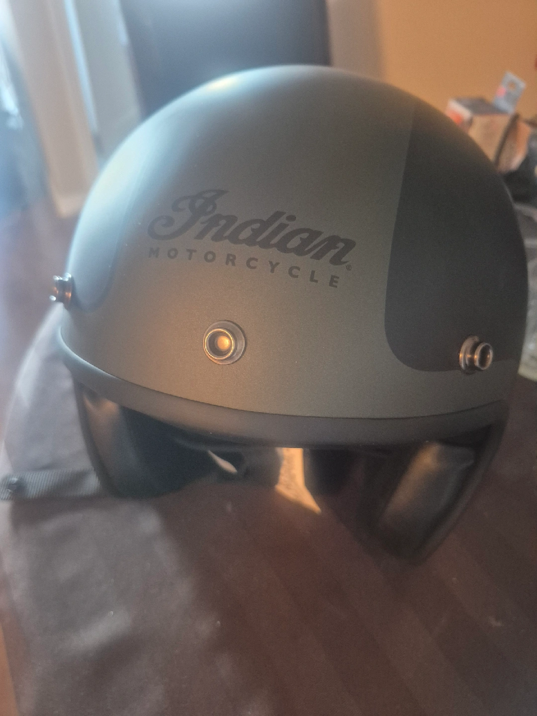Selling an Indian Motorcycle open face helmet in size small. It's a sleek matte black and green colour. Part number is 286280802. The helmet is certified with DOT standards and has an open face helmet A5000 design. Originally priced at $234.99. Beautiful never used. Has bag for it as well as box. Asking $200
