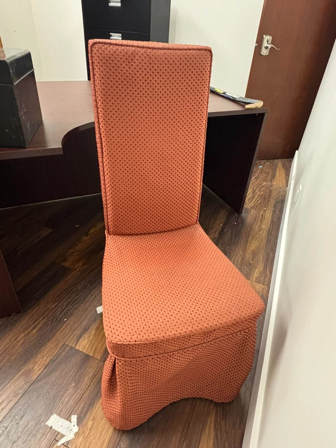 Selling a lovely upholstered dining chair in a terracotta colour. It's in great shape and would look perfect in any dining room or as an accent chair. The fabric is soft and comfortable, making it a great addition to your home!