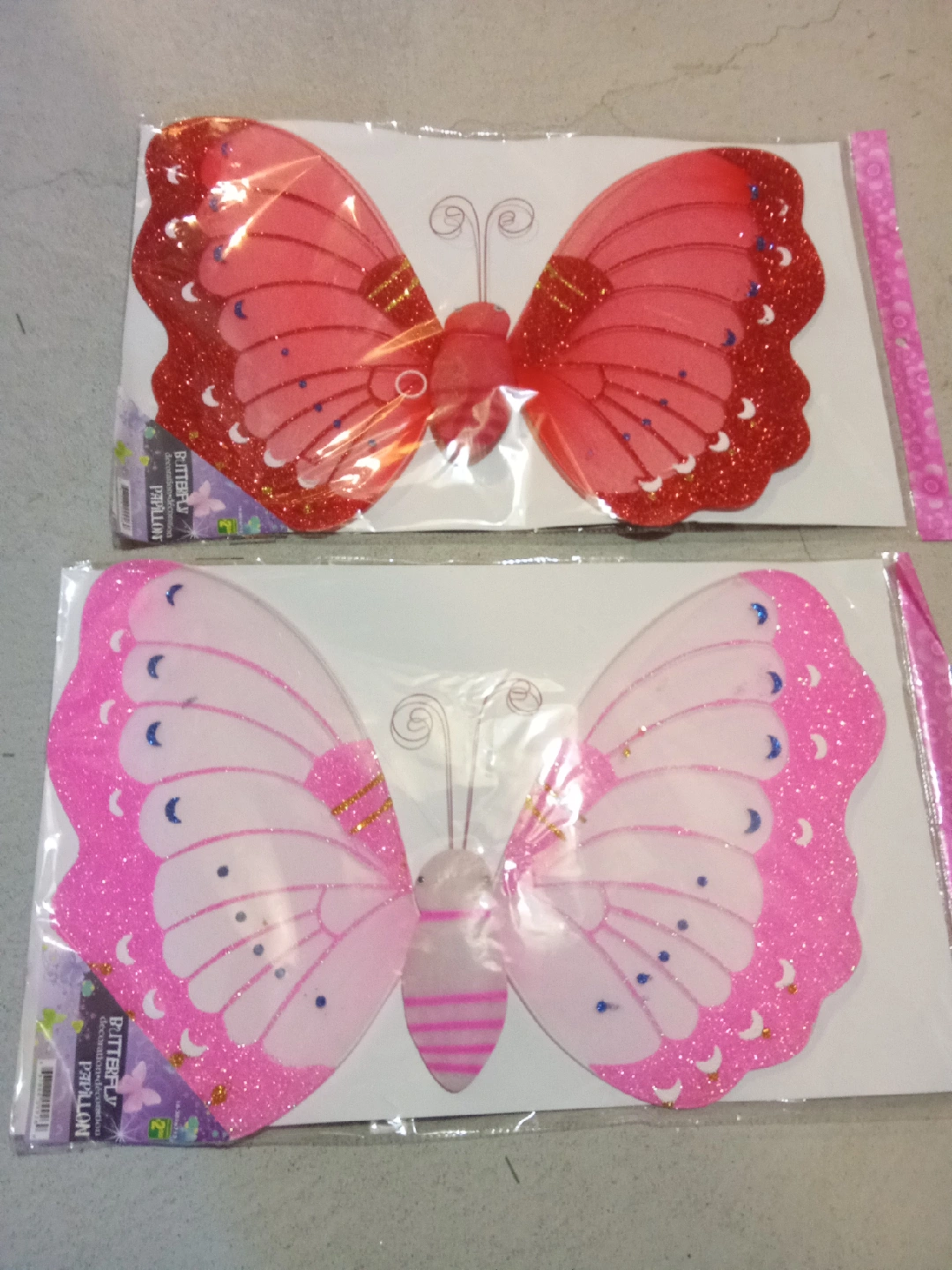 Add a touch of whimsy to any space with these adorable butterfly decorations! One is red and the other is pink. They're perfect for adding a pop of colour and sparkle to your home or party