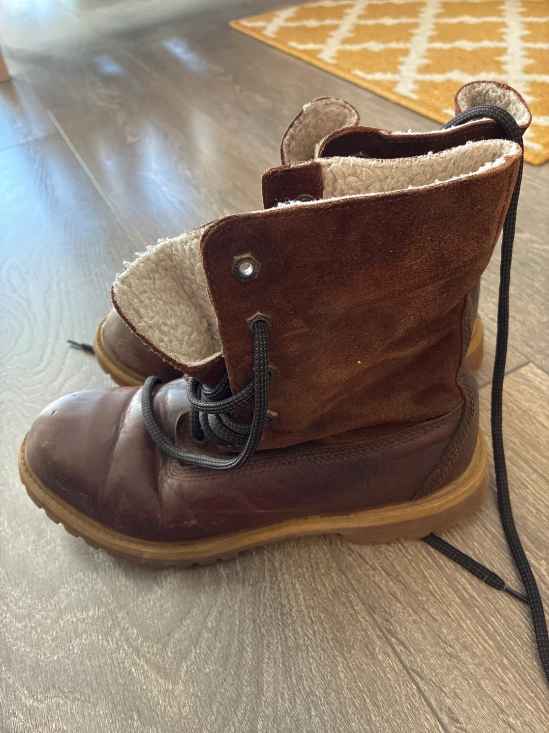 Selling a pair of Timberland Earthkeepers boots in a nice brown leather colour. They are a size 7.5, and have a cozy, warm lining. They show some signs of wear but are still in good condition for everyday use.