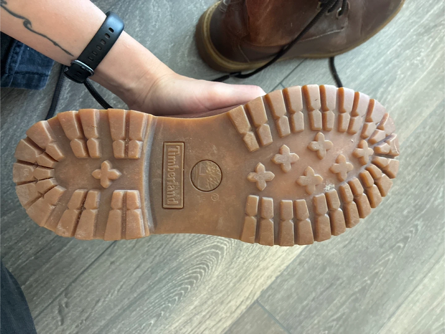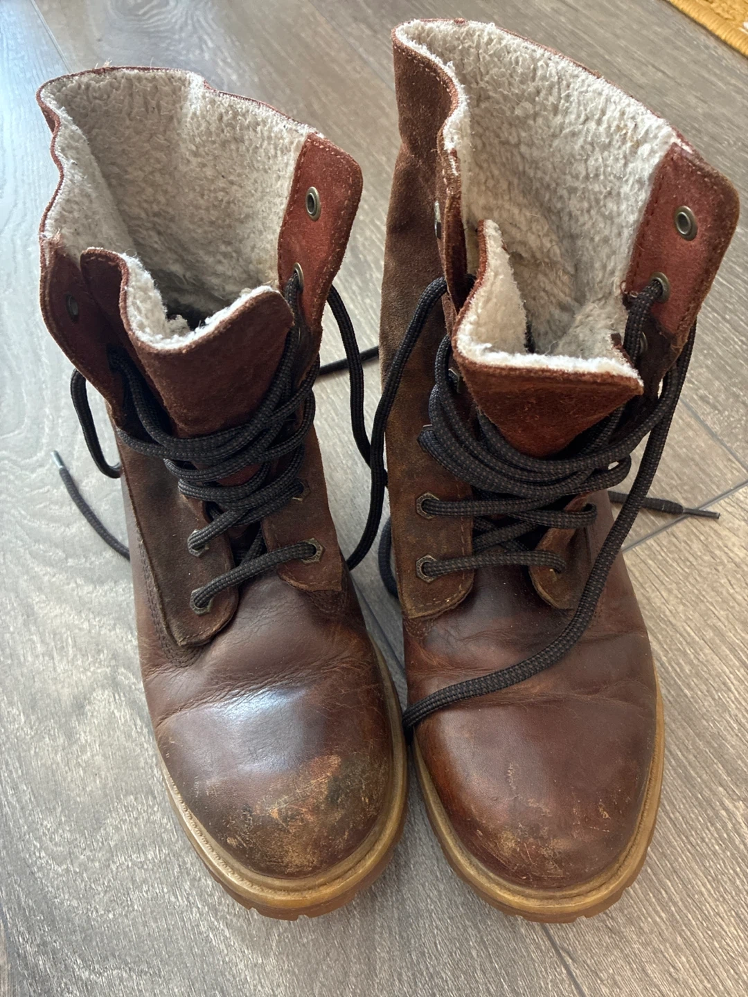 Selling a pair of Timberland Earthkeepers boots in a nice brown leather colour. They are a size 7.5, and have a cozy, warm lining. They show some signs of wear but are still in good condition for everyday use.