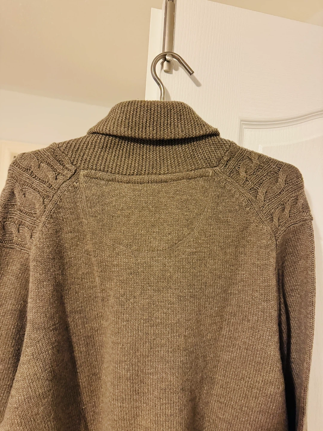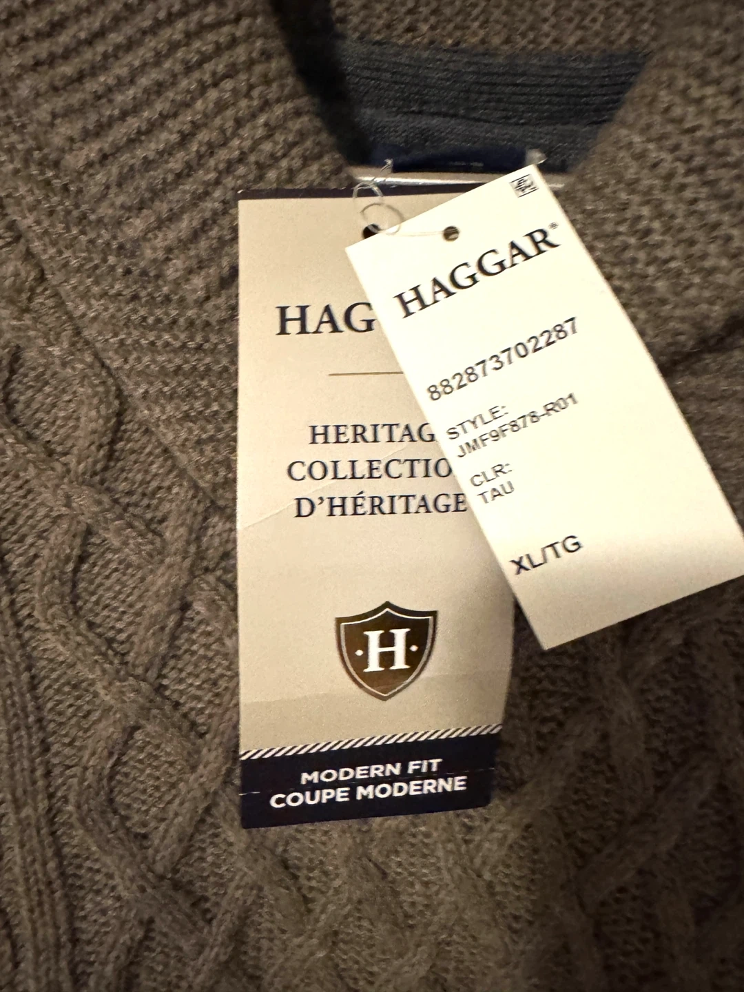 This is a Haggar men's shawl collar sweater. It's a taupe colour with a cable knit design. The size is XL/TG and it's part of their Heritage Collection. It's a modern fit sweater.