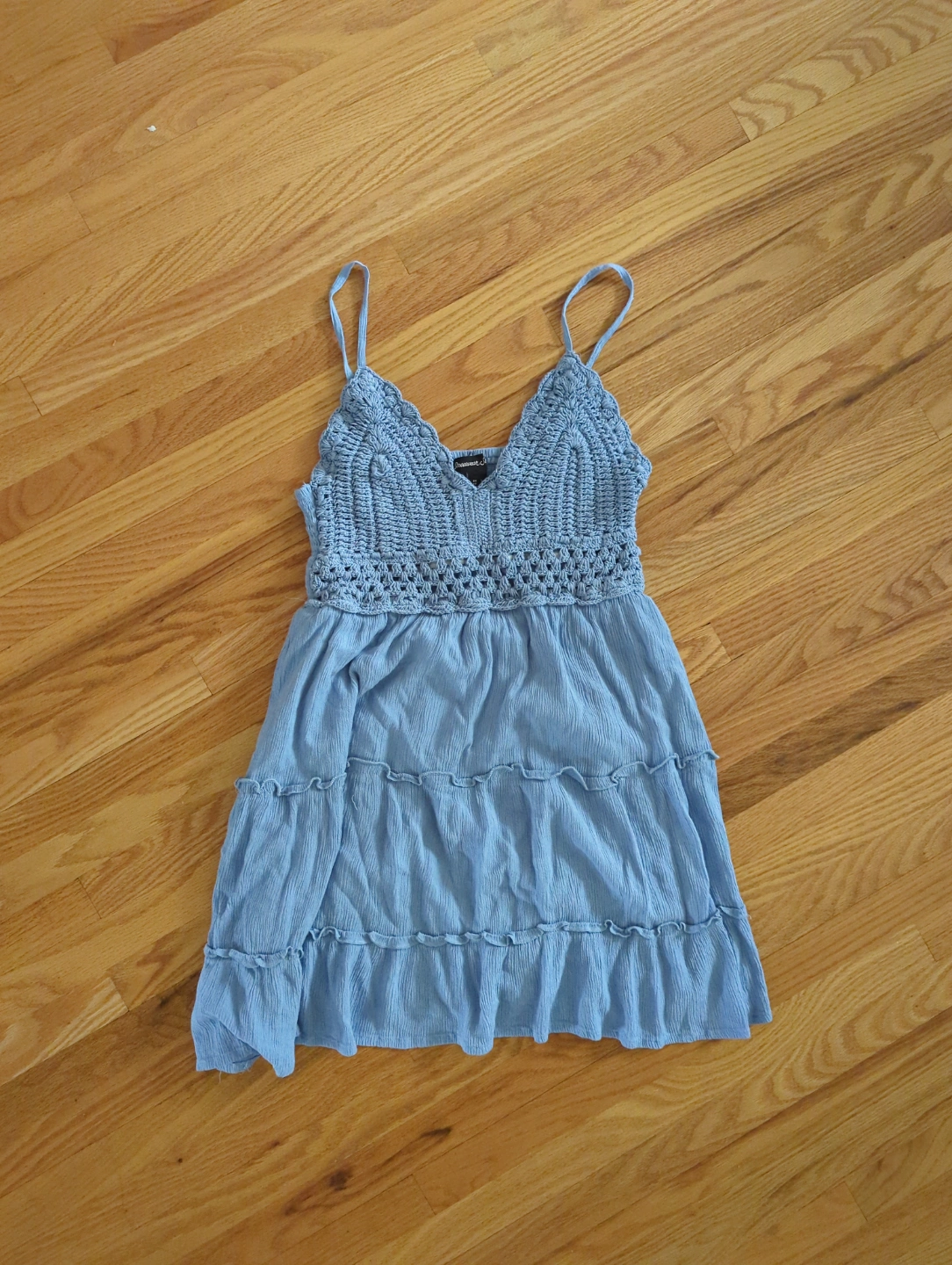 Lightweight summer dress. Crochet top and tiered skirt. Dusty blue colour. Perfect for warm weather.