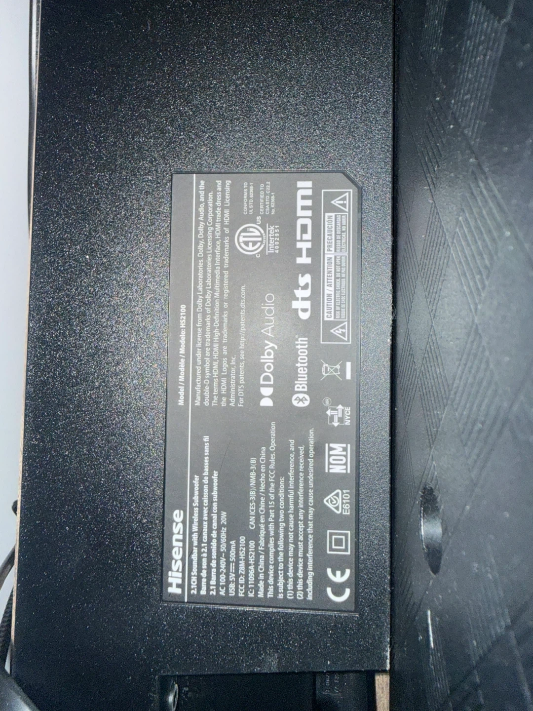 Selling a Hisense 2.1CH Soundbar with Wireless Subwoofer, model HS2100. It's in great condition and ready to boost your home theatre experience! This soundbar features Dolby Audio and DTS:X technologies for immersive sound quality. It connects via Bluetooth and HDMI.