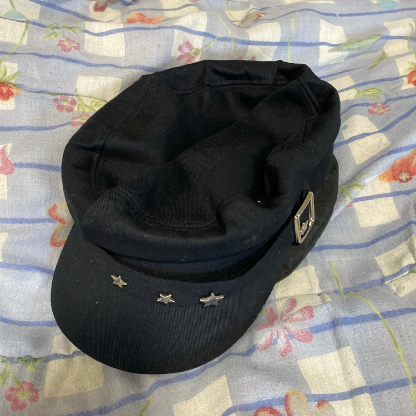 Selling a stylish black newsboy cap! It features cute star details on the brim and a buckle accent on the side. Great for adding a touch of flair to any outfit!