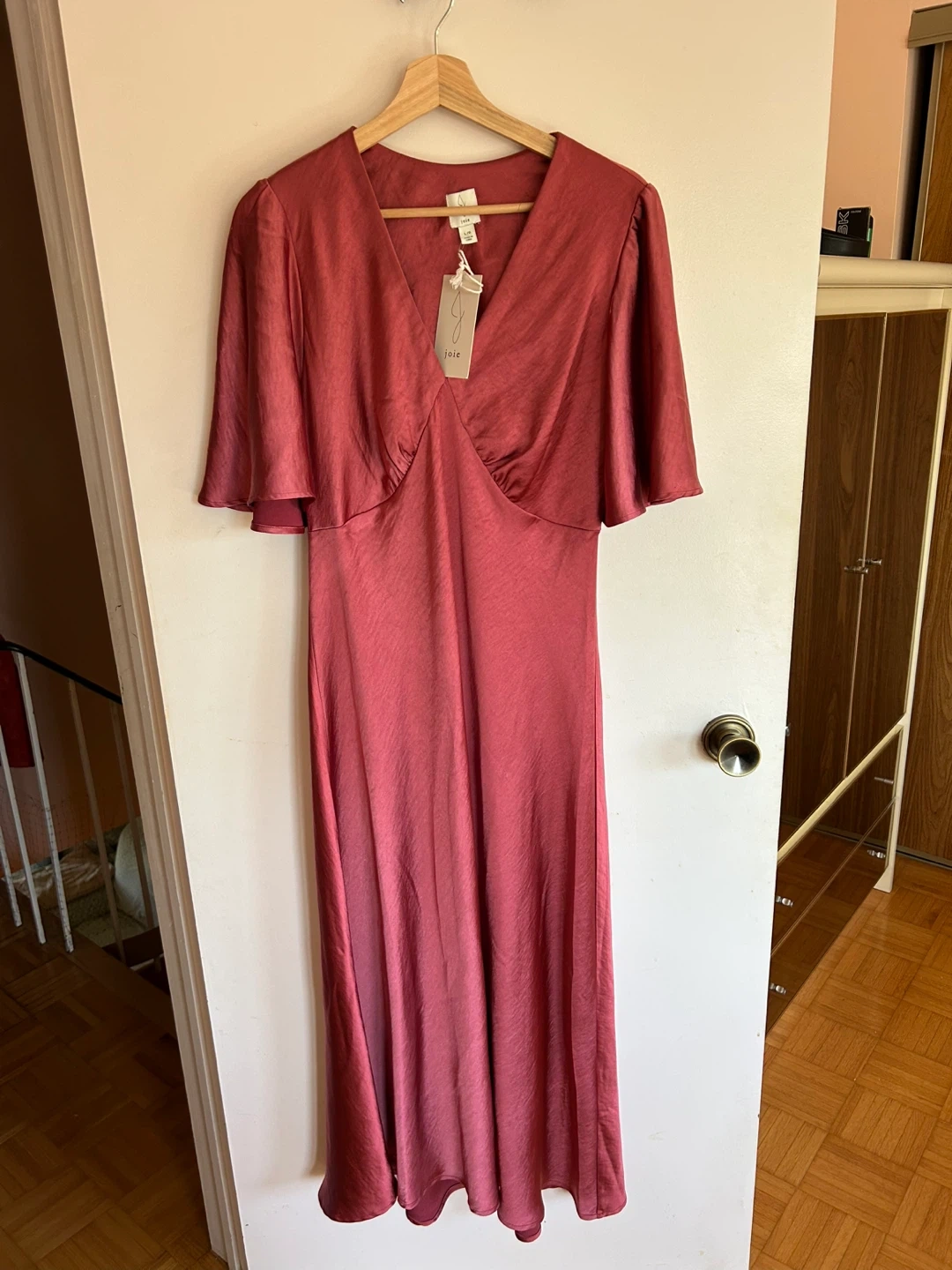 466Selling a beautiful satin Joie dress in a lovely rose colour, falls just above the ankles, with butterfly sleeves. It's a size L/G. Perfect for a special occasion or a night out. Bought for $50 from Winners. There are are a few thread pulls, hence the lower price.