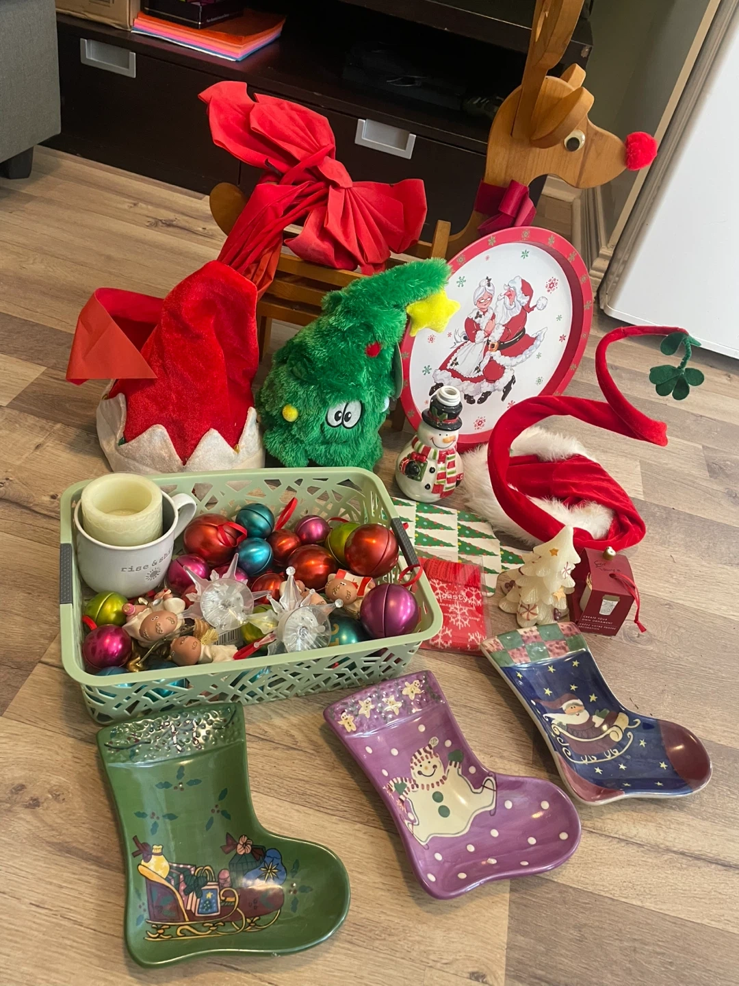 A bundle of Christmas decorations, perfect for adding some holiday cheer to your home! Includes ornaments, stockings, and other festive items to brighten up your space this holiday season