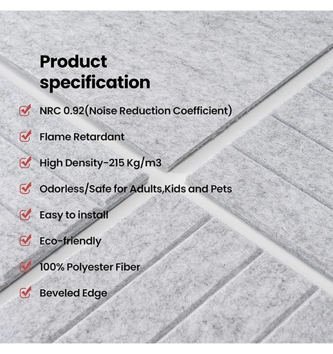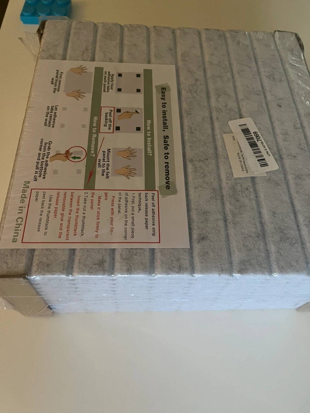 These are a set of 12 brand new sound-absorbing panels. Each panel measures 12x12 inches and is 0.4 inches thick. They're made of 100% polyester fiber, so they're odorless and safe for adults, kids, and pets. Plus, they're easy to install and remove!