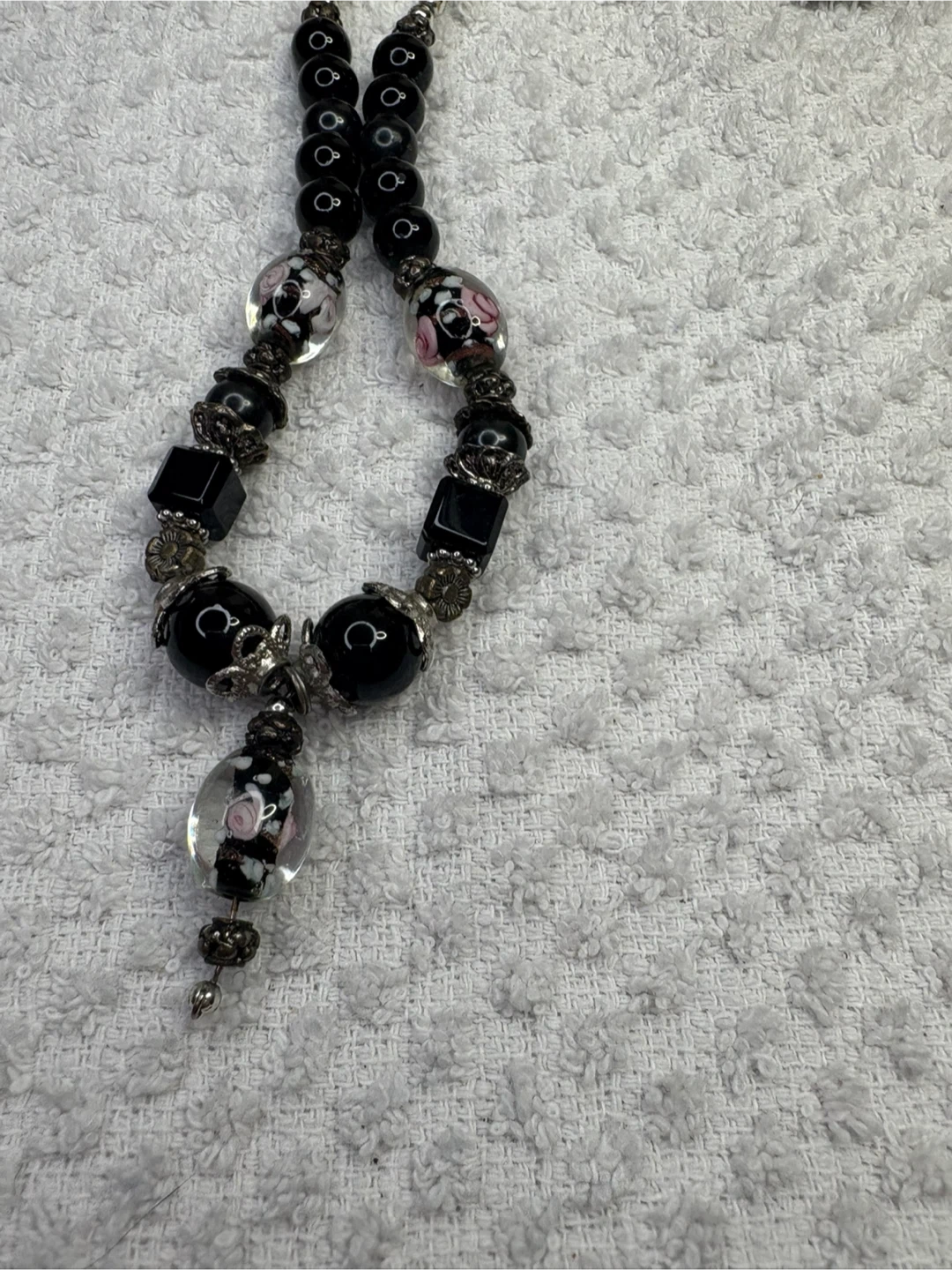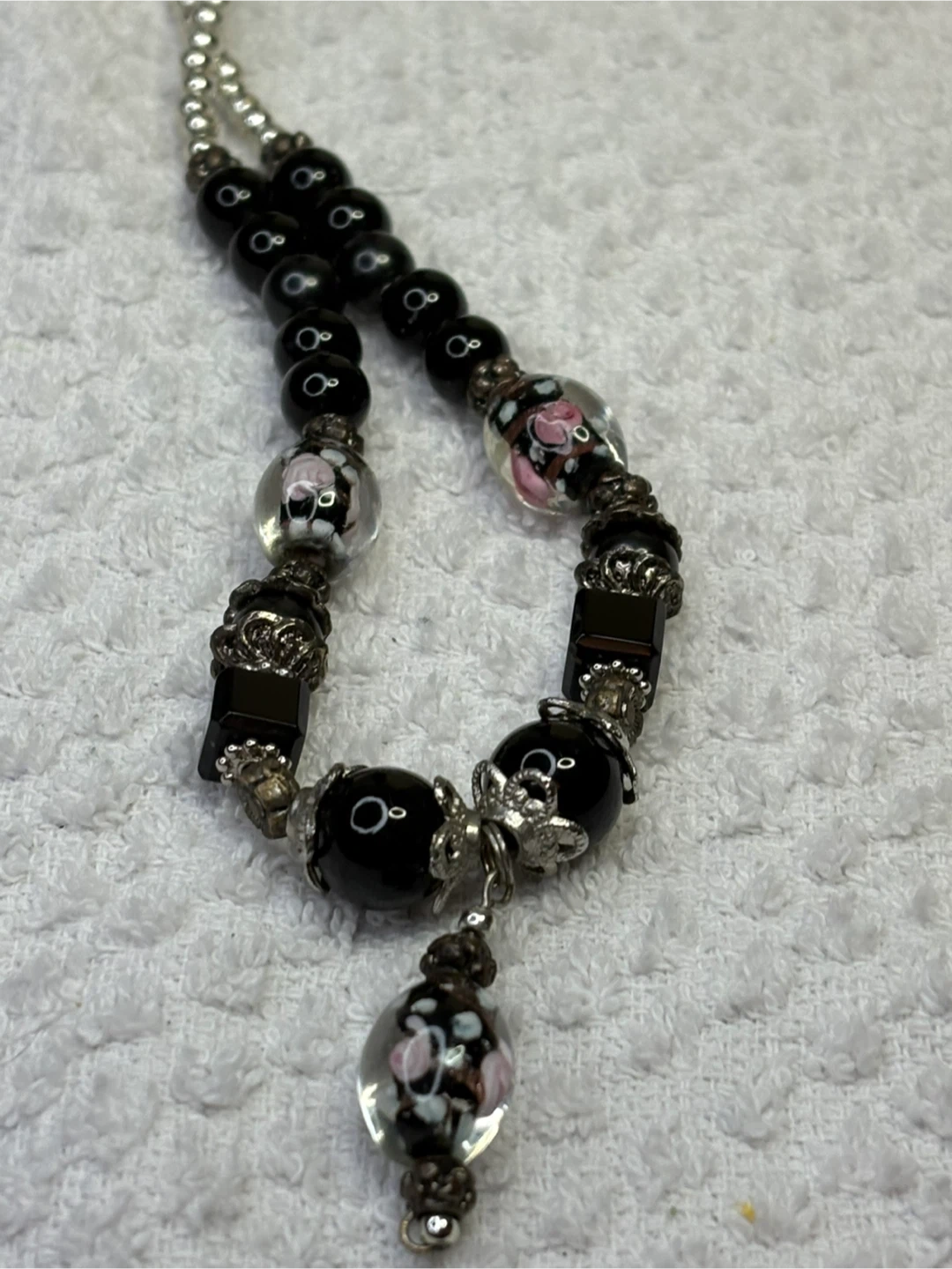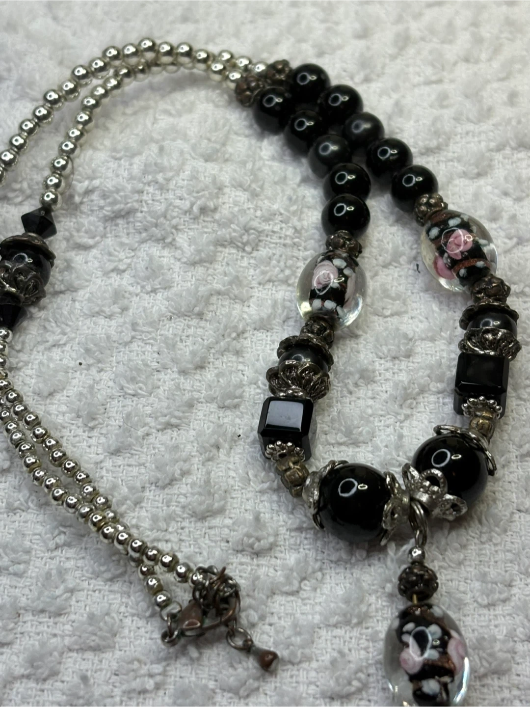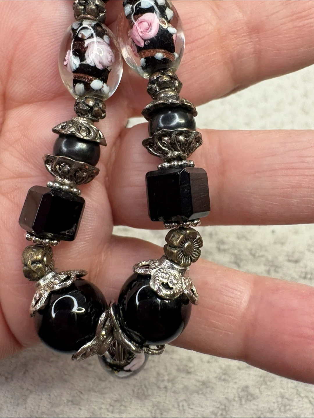 This is a beautiful onyx and Murano glass beaded necklace with unique floral accents. It features a mix of round and square black beads, along with clear glass beads with delicate pink and white floral designs. The necklace also has silver-toned metal accents that add to its charm. It's a lovely piece to add a touch of elegance to any outfit