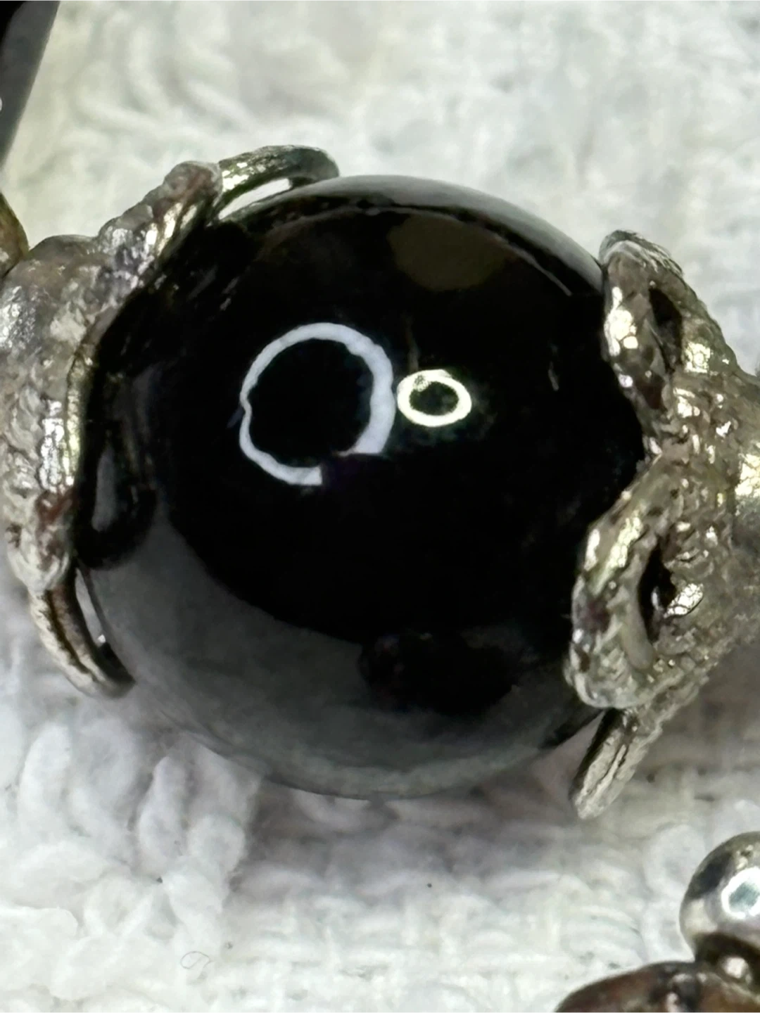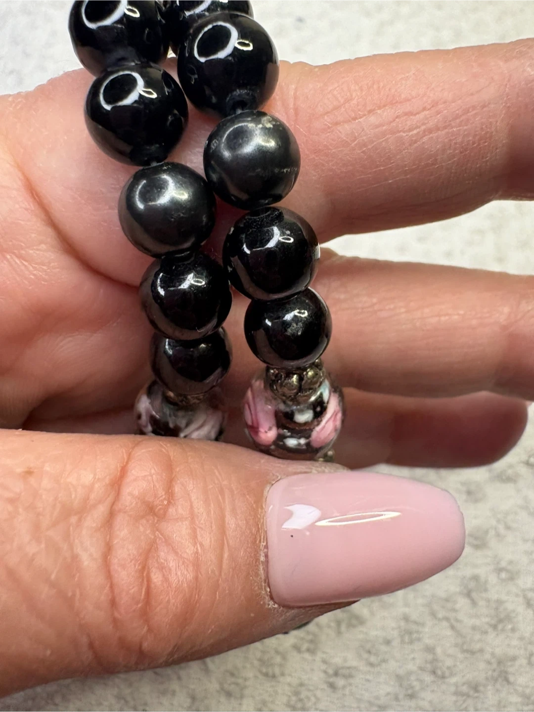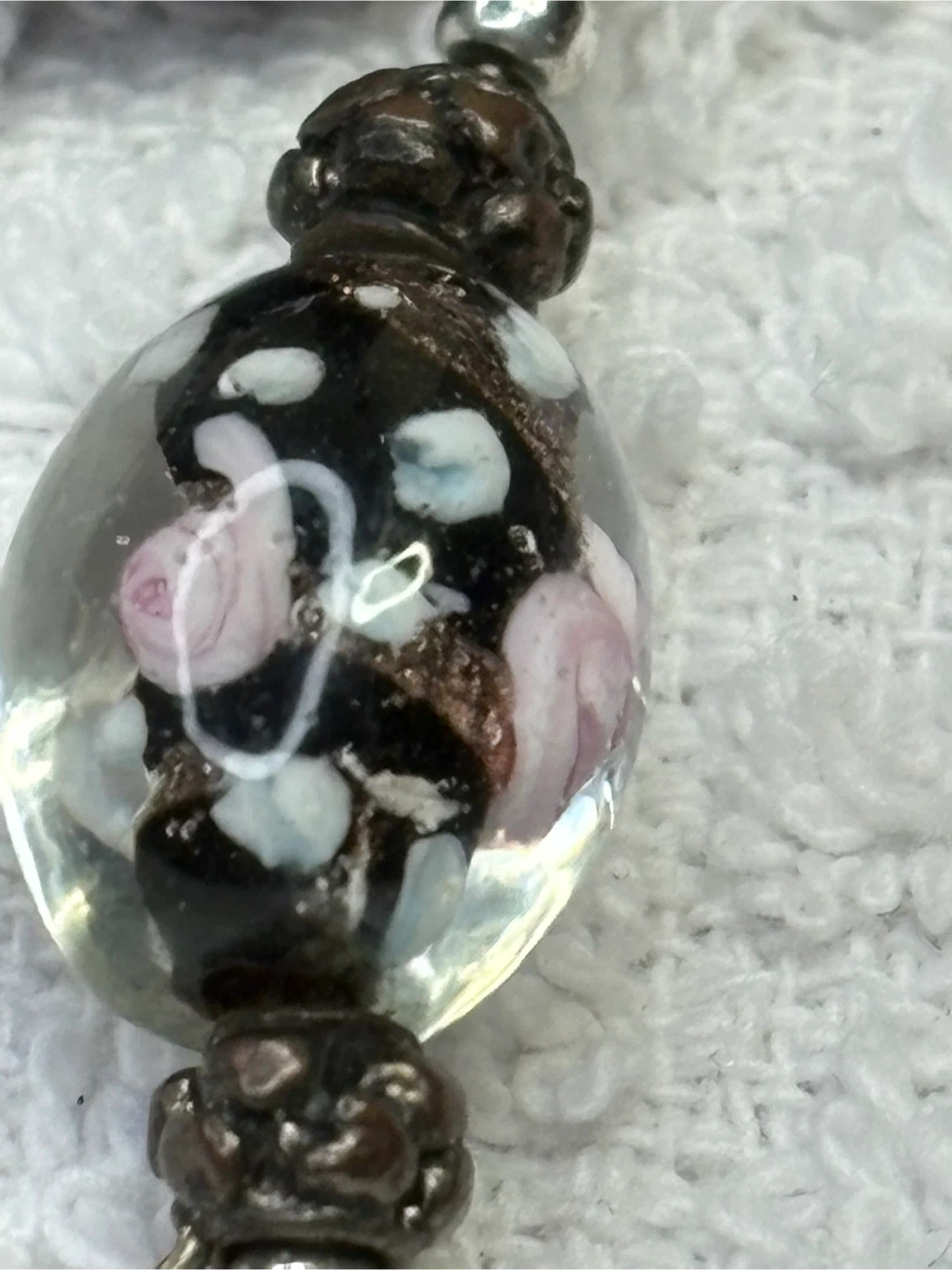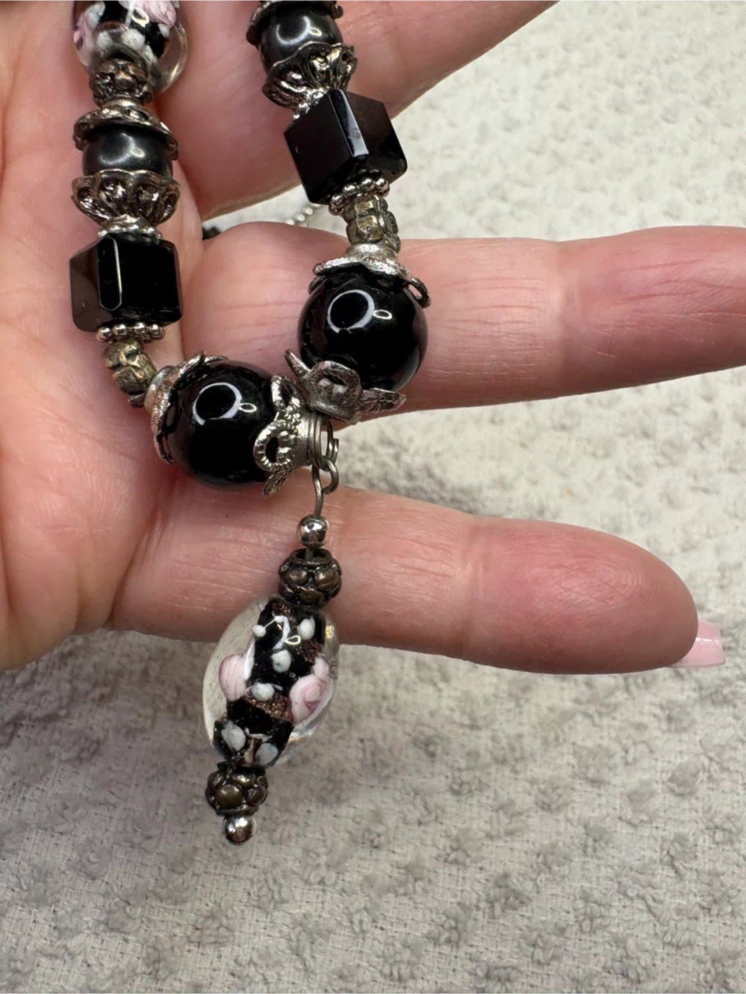 This is a beautiful onyx and Murano glass beaded necklace with unique floral accents. It features a mix of round and square black beads, along with clear glass beads with delicate pink and white floral designs. The necklace also has silver-toned metal accents that add to its charm. It's a lovely piece to add a touch of elegance to any outfit