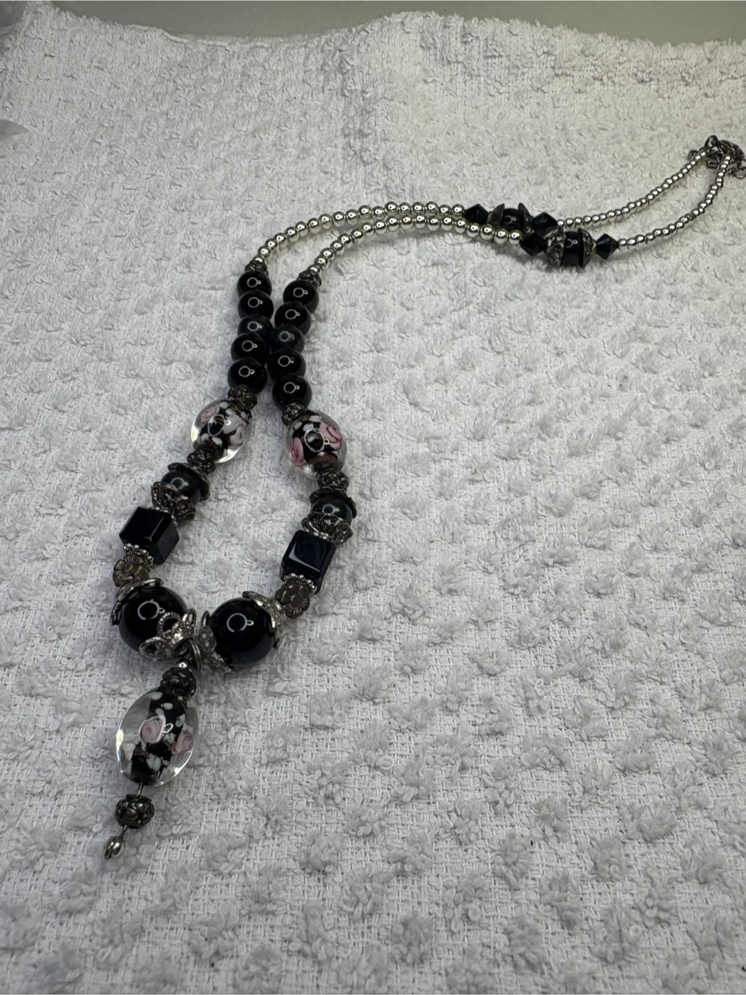 This is a beautiful onyx and Murano glass beaded necklace with unique floral accents. It features a mix of round and square black beads, along with clear glass beads with delicate pink and white floral designs. The necklace also has silver-toned metal accents that add to its charm. It's a lovely piece to add a touch of elegance to any outfit
