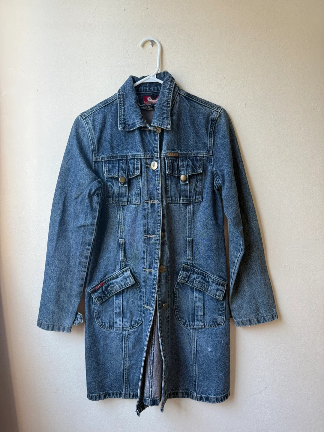 Cute denim jacket dress from D.S.G.B in size medium! This stylish piece is made of comfortable jeans wear material and features a button-up design with pockets.