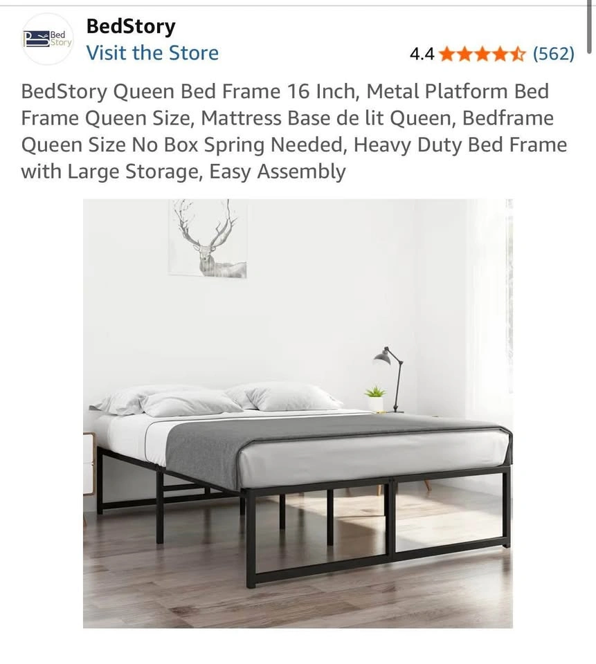 Queen size BedStory 10” memory foam mattress and a sturdy 16” metal bed frame with plenty of under-bed storage. Both are in excellent, clean condition from a smoke-free, pet-free home.