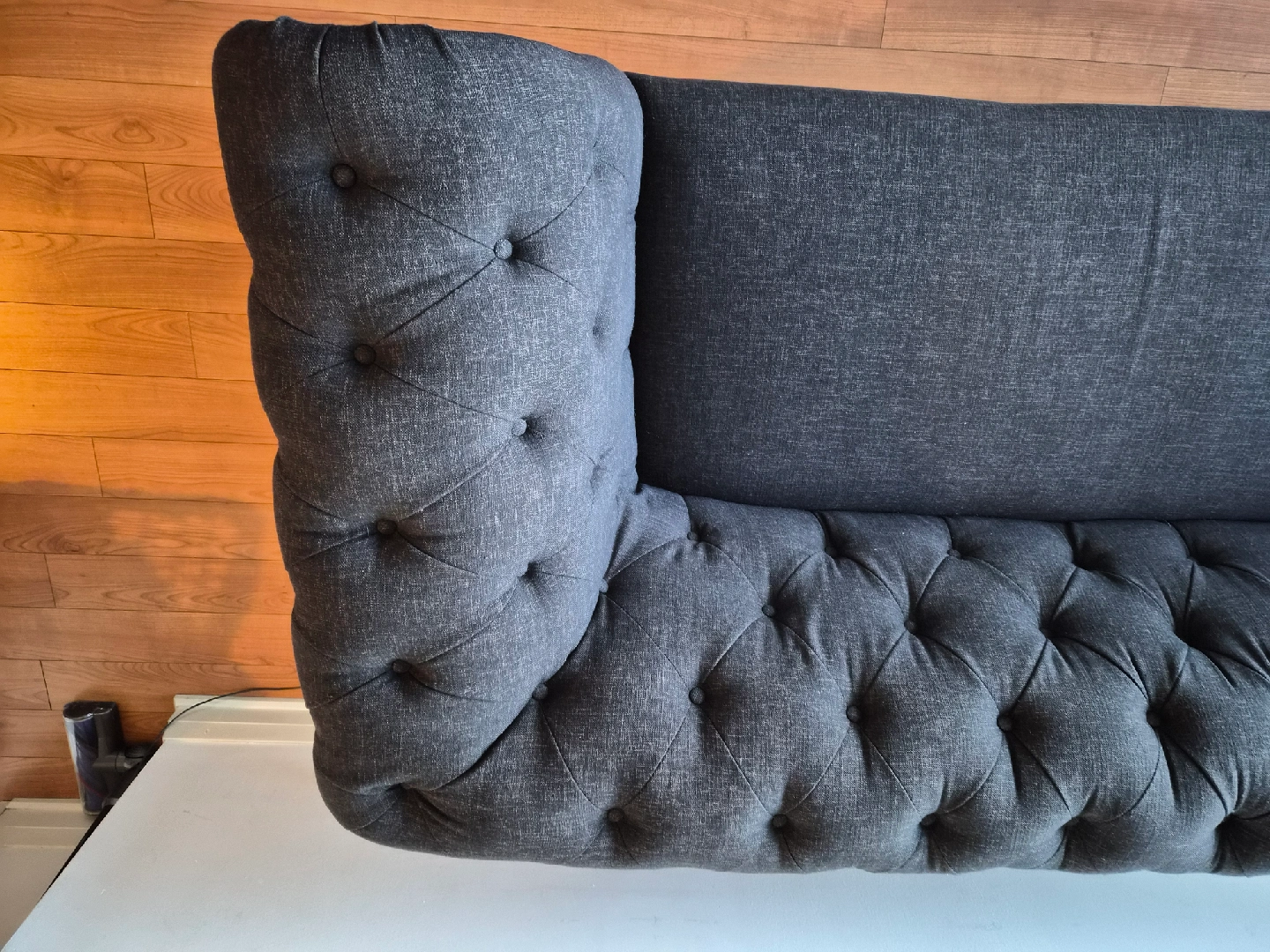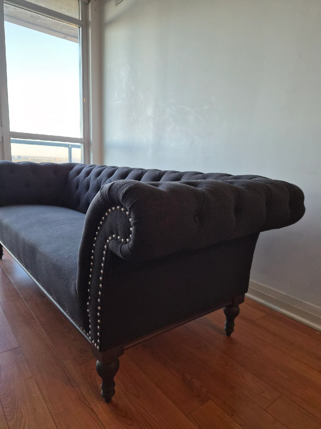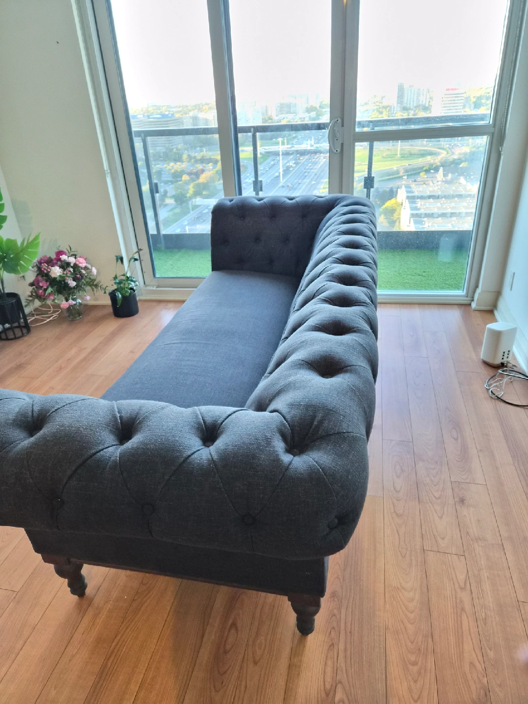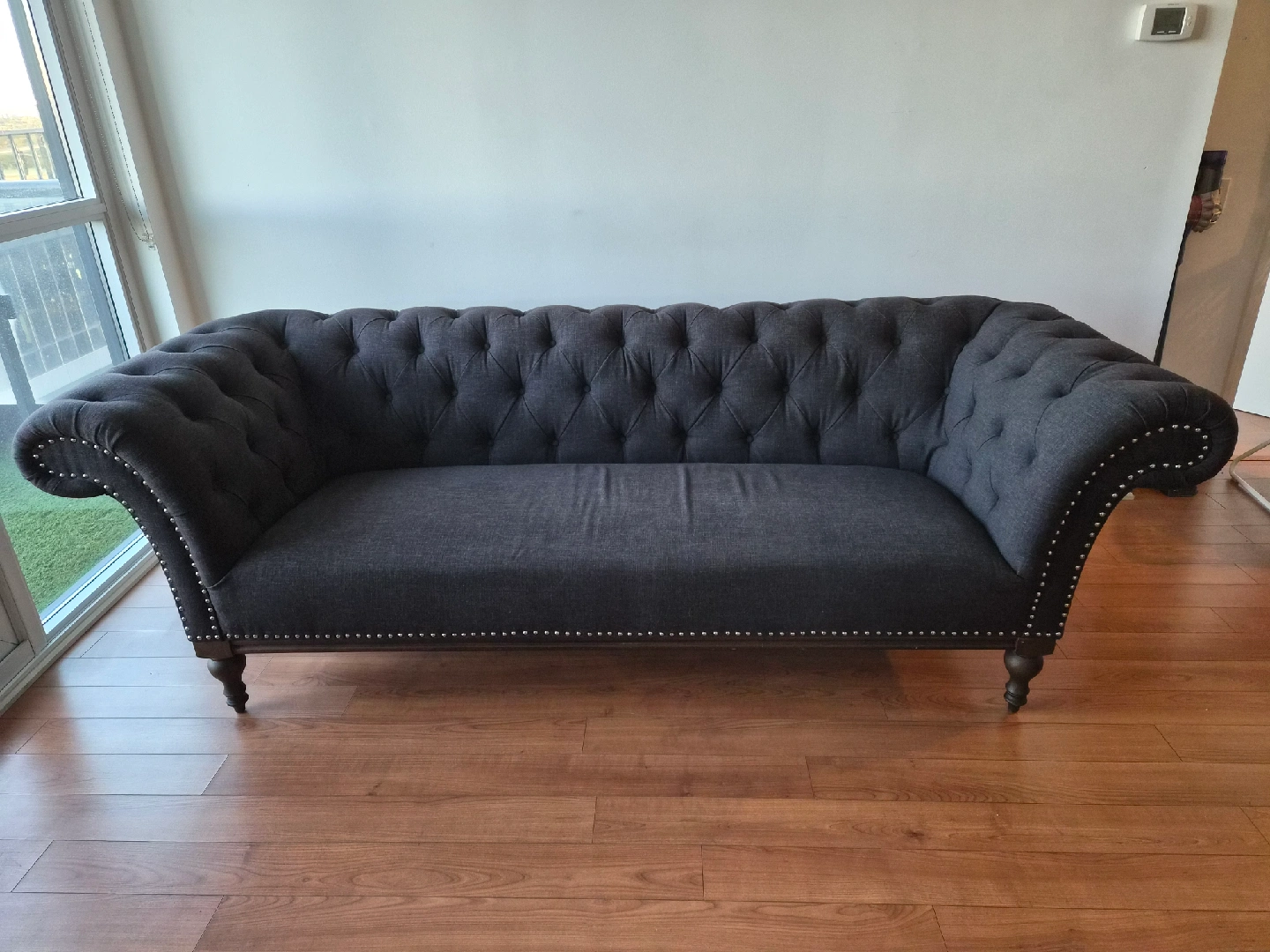 Moving Sale - Selling a comfy grey chesterfield style sofa. It would be a perfect addition to any living room. It's in great condition, non smokers and no pets home. Ready for a new home!
