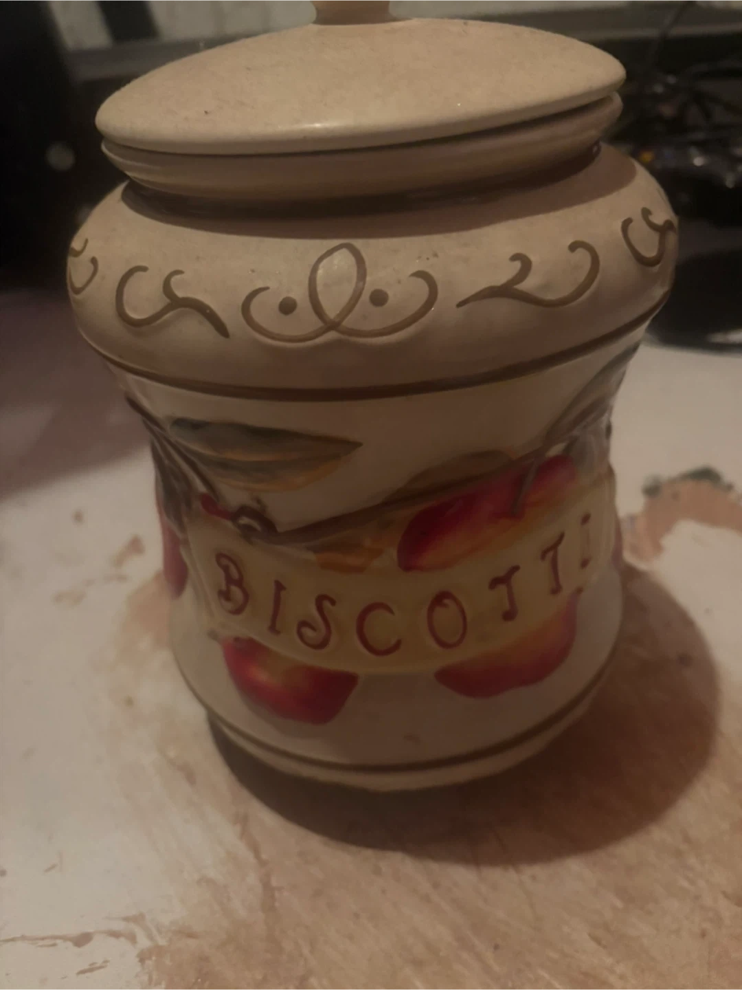 Selling a cute biscotti jar with a lid. It's in great condition and ready to store your favourite treats! The jar has a lovely design with biscotti written on it. Perfect for adding a touch of charm to your kitchen