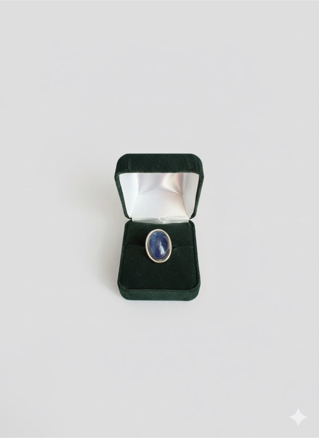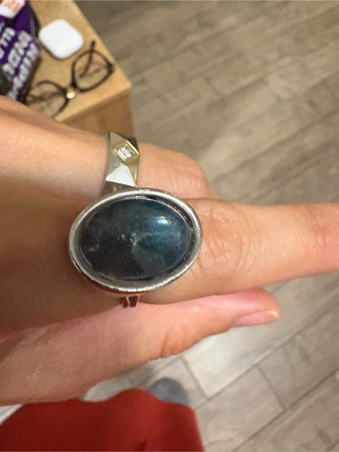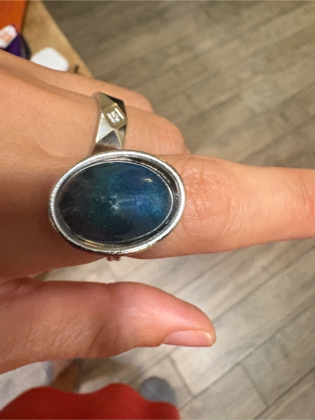 84Selling a ring with a beautiful oval blue stone! It comes in a box, perfect for gifting or keeping it safe. The ring has a silver band. It's in great condition and ready for a new home! Adjustable size Feel free to also check my other listings make a bundle with discount.