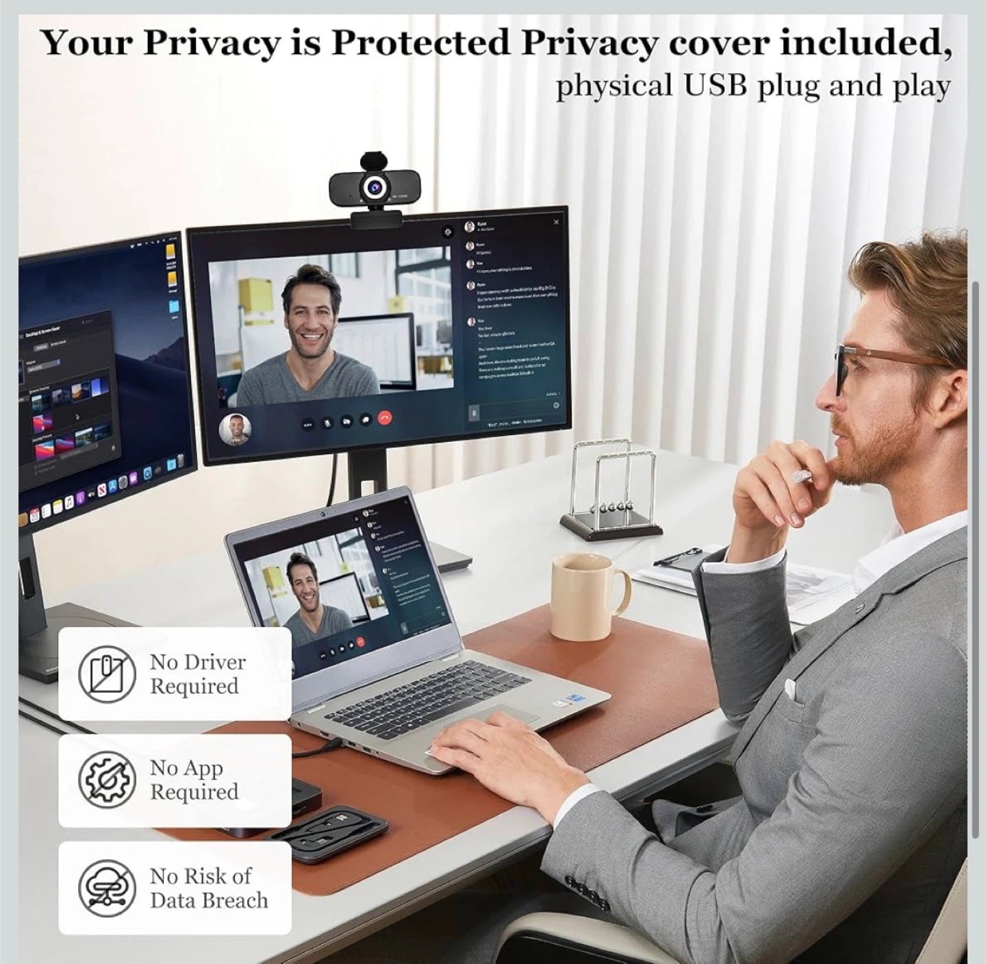 Selling a FULL HD 1080p webcam. It features a built-in noise reduction mic for clearer audio and is easy to use. It has a 110-degree widescreen view, perfect for video conferencing and multi-person chat. The webcam also includes a privacy cover and is plug and play, so no drivers or apps are required. It also has a tripod.
