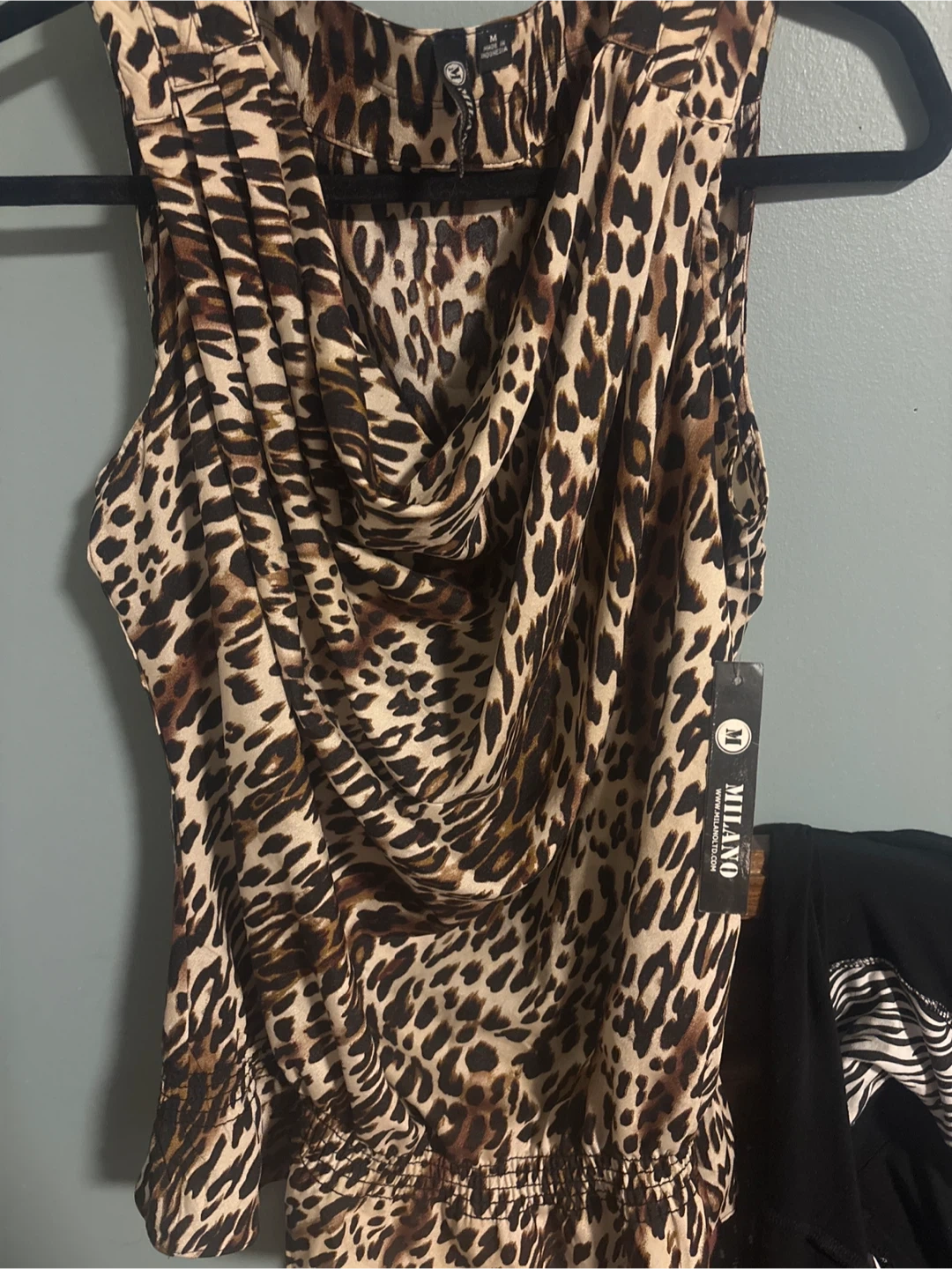 60Selling a Milano top with a stylish leopard print. It features a cowl neck and is a size medium. Perfect for adding a bit of flair to your wardrobe! *with tags!!!**Was $54, asking $25.