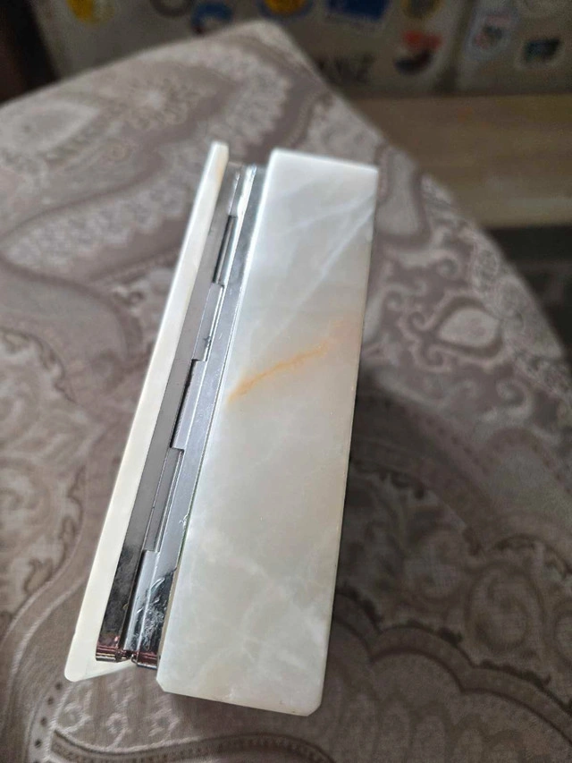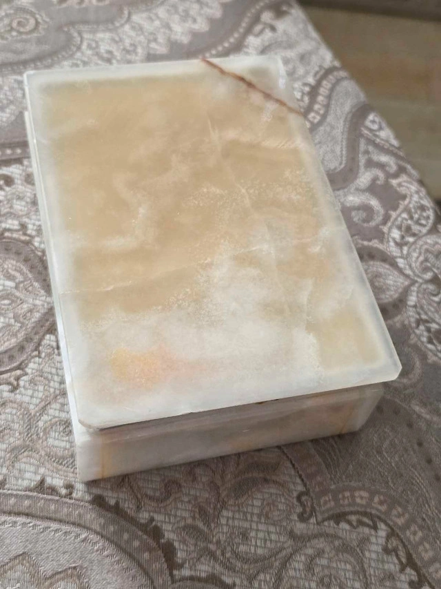 51Adorn your space with this elegant, used onyx box featuring a soft, green felt interior and metal trim, perfect for stashing jewellery or precious keepsakes. The box has some wear, which is reflected in the price, but is overall a beautiful piece. There are some imperfections congruent with its age. High quality hinged. Imagine this little treasure chest sitting pretty on your dresser, holding all your secrets and sparkling jewels! It's just waiting to be adopted into a loving home. Psst! If the ad's still up, it's still available!