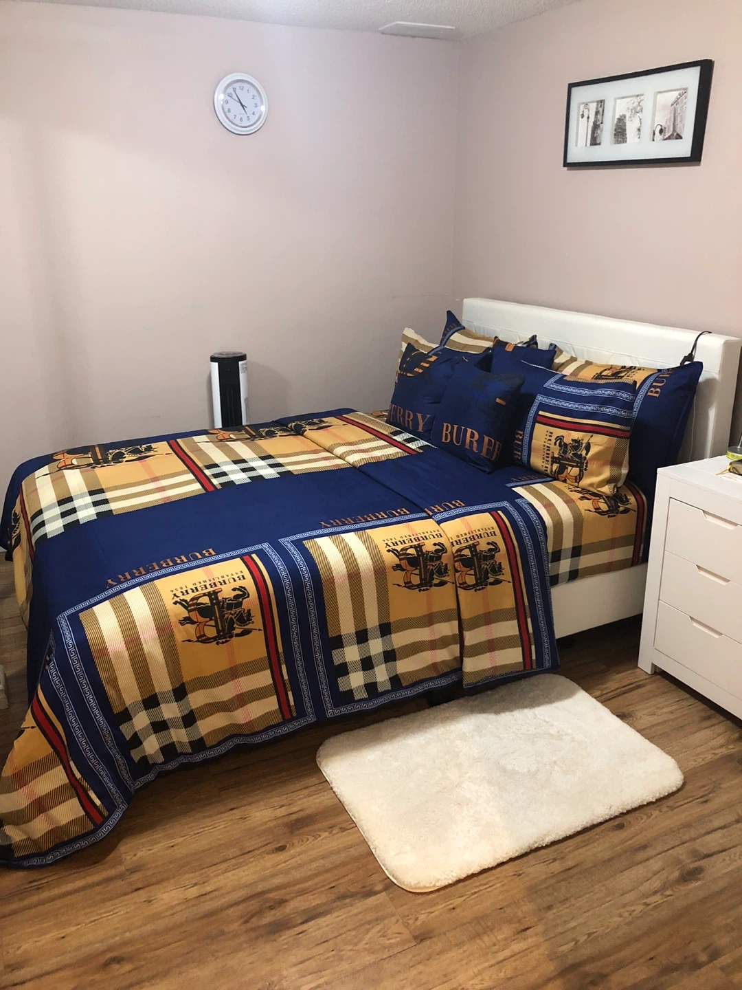Selling a Burberry bedding set. The set includes a duvet cover and pillowcases. It features a classic Burberry check pattern in blue, beige, and red tones.