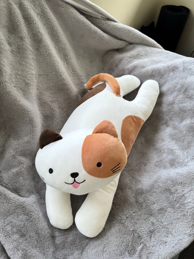 67These delightful calico plushes are in excellent condition and ready to bring joy to a new home! The first is a round plushie with an adorable face and a heart embroidered on the side. The other is a long, huggable friend, perfect for snuggling. Both are soft, clean, and looking for a cozy spot to land. If this ad is still up, these cuddly companions are available!