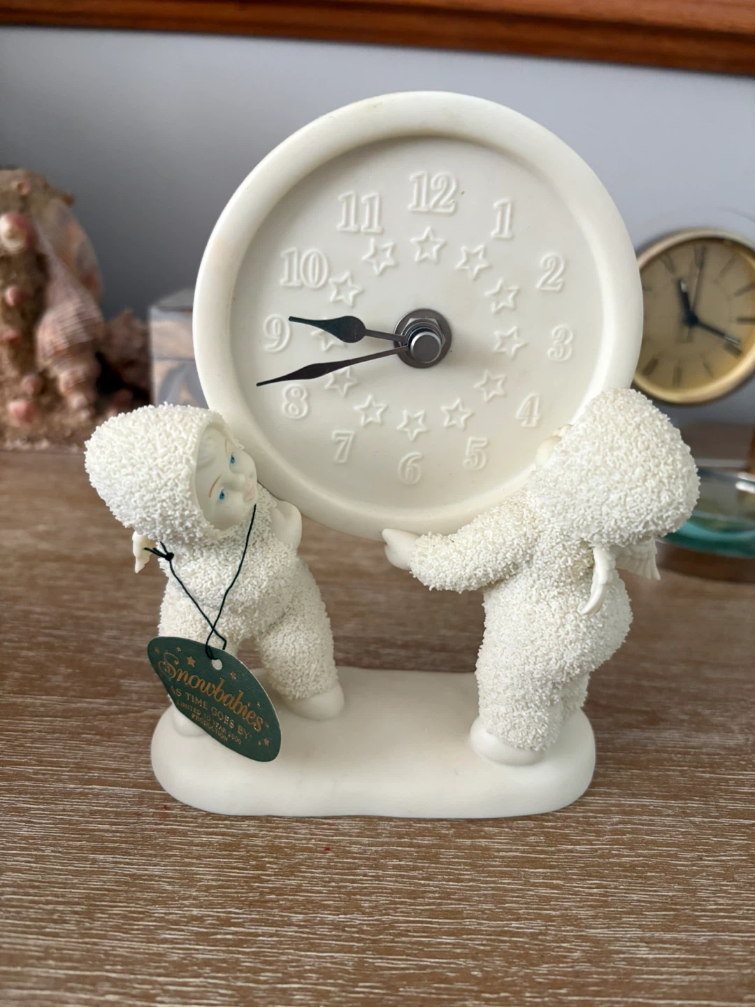 Cute Snowbabies clock . It features two snowbabies holding up a clock face with star accents. It is in perfect condition but does not keep accurate time, yet still a lovely addition to any collection. Niagara Falls north end location. Cash only
