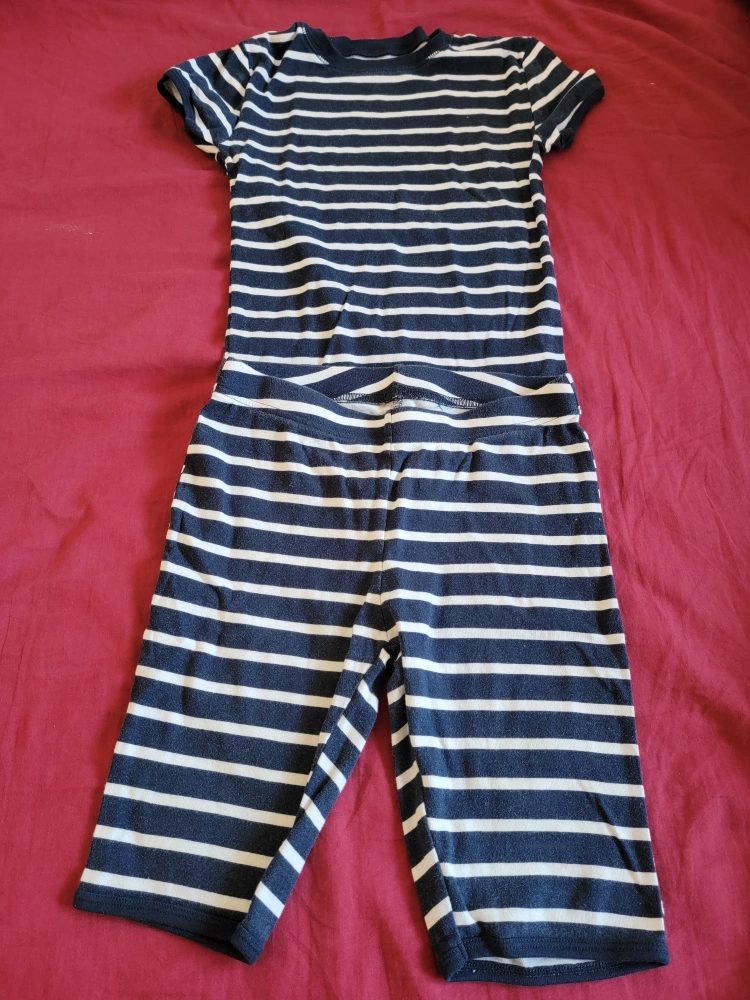 A cute striped one-piece outfit. It's in great condition and ready for a new home! The outfit features a navy blue and white striped pattern.