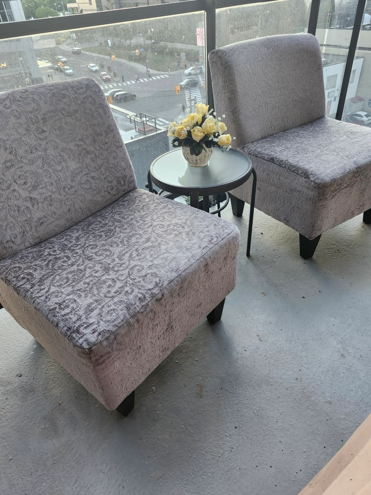 311Selling a pair of lovely grey accent chairs. It's in great condition and would look great in any living room or bedroom. The chairs are made of a soft, patterned fabric and have a comfortable seats. Dimensions are approximately 31" high, 27.5" wide, and 22.5" deep.