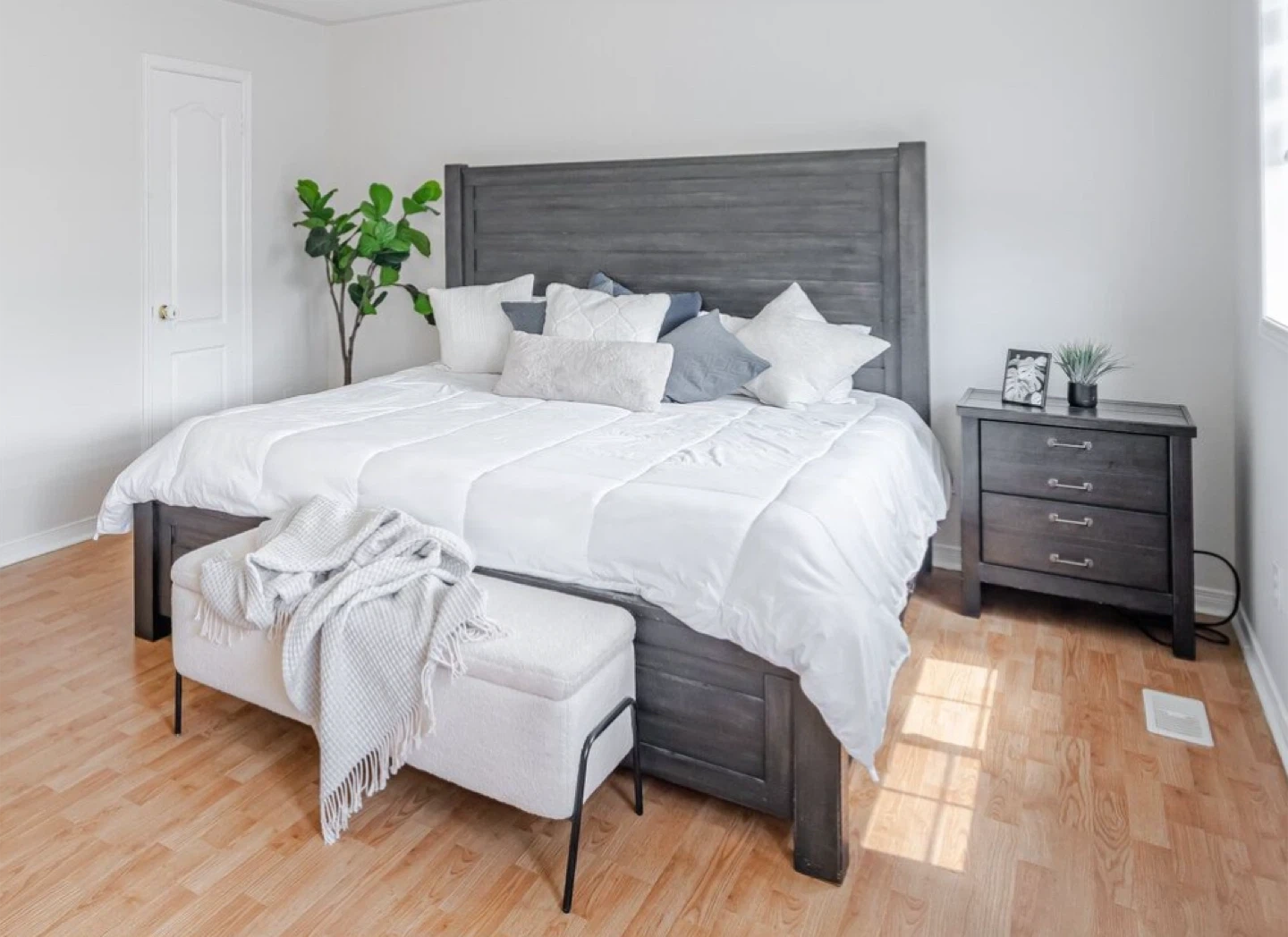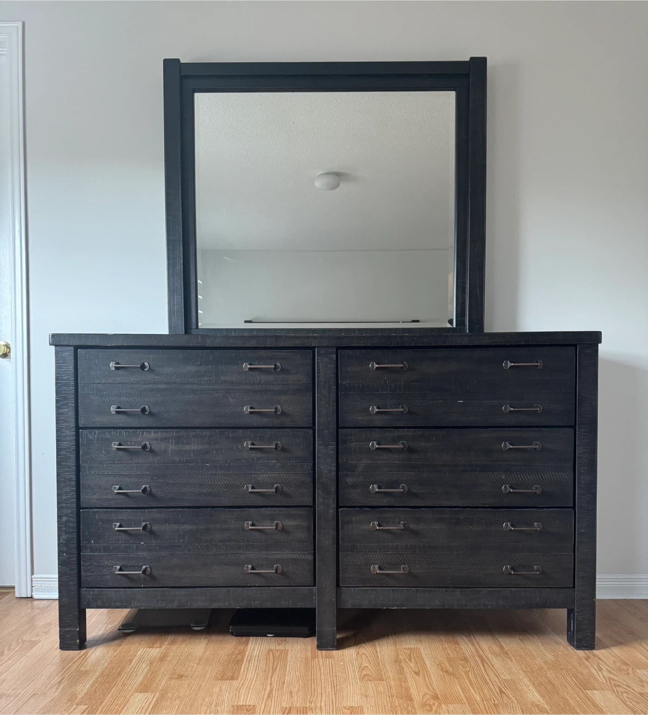 Selling a bedroom set including a bed frame, dresser with mirror, and a nightstand. The set is in good condition and would be great for someone looking to furnish a bedroom. The colour is a dark grey/brown.