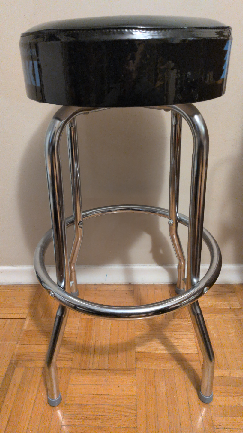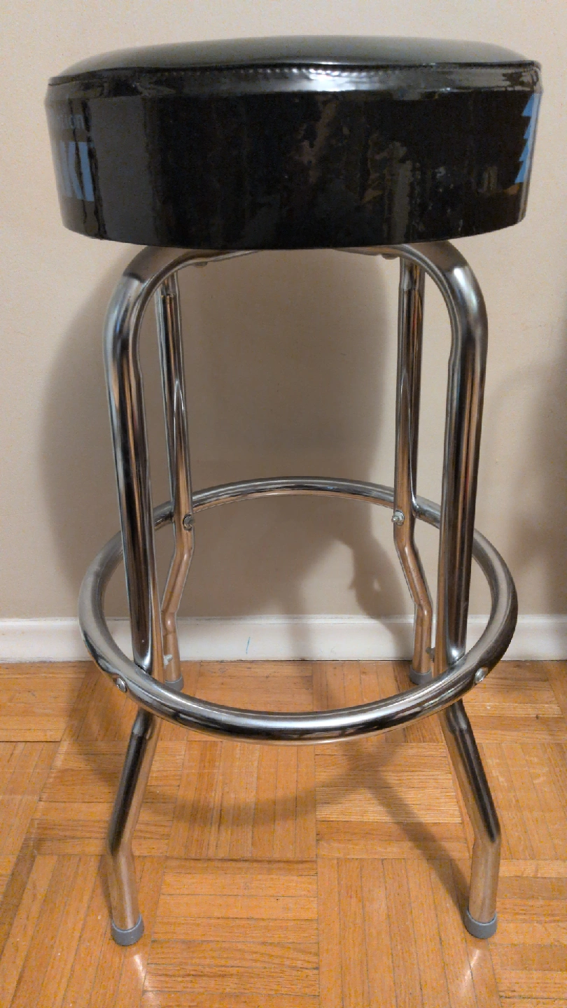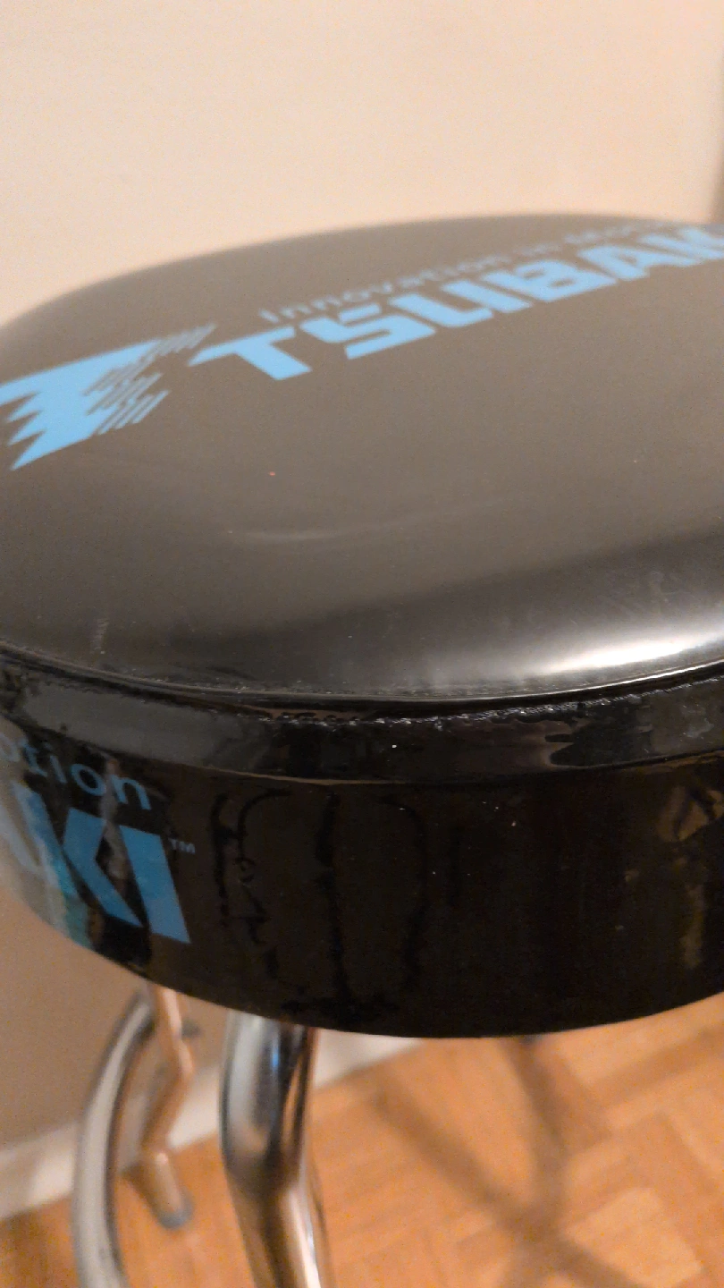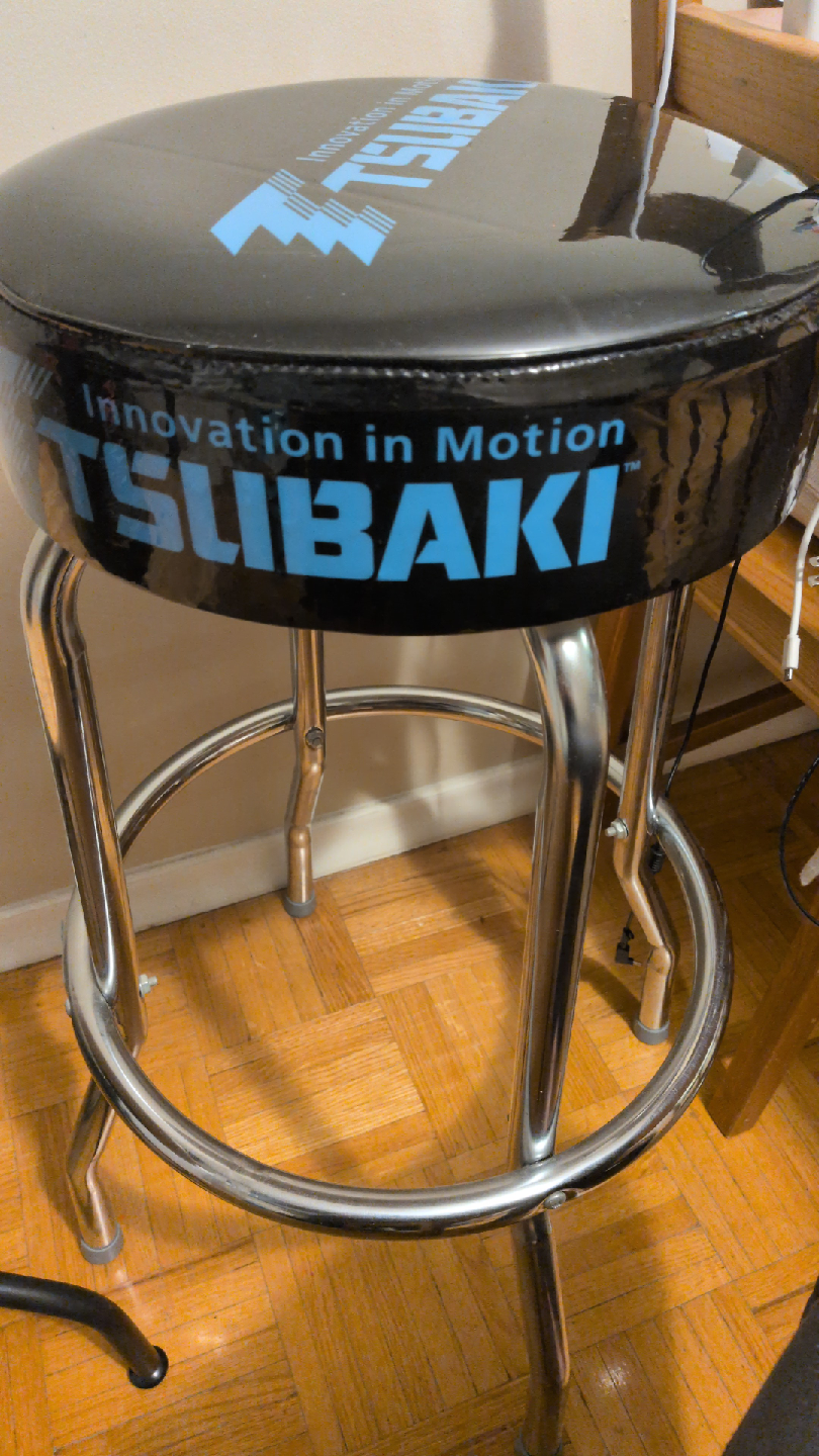 Selling a bar stool branded with 'Tsubaki Innovation in Motion'. The stool has a black padded seat and chrome legs. It's in good condition and would be great for a garage or bar area!