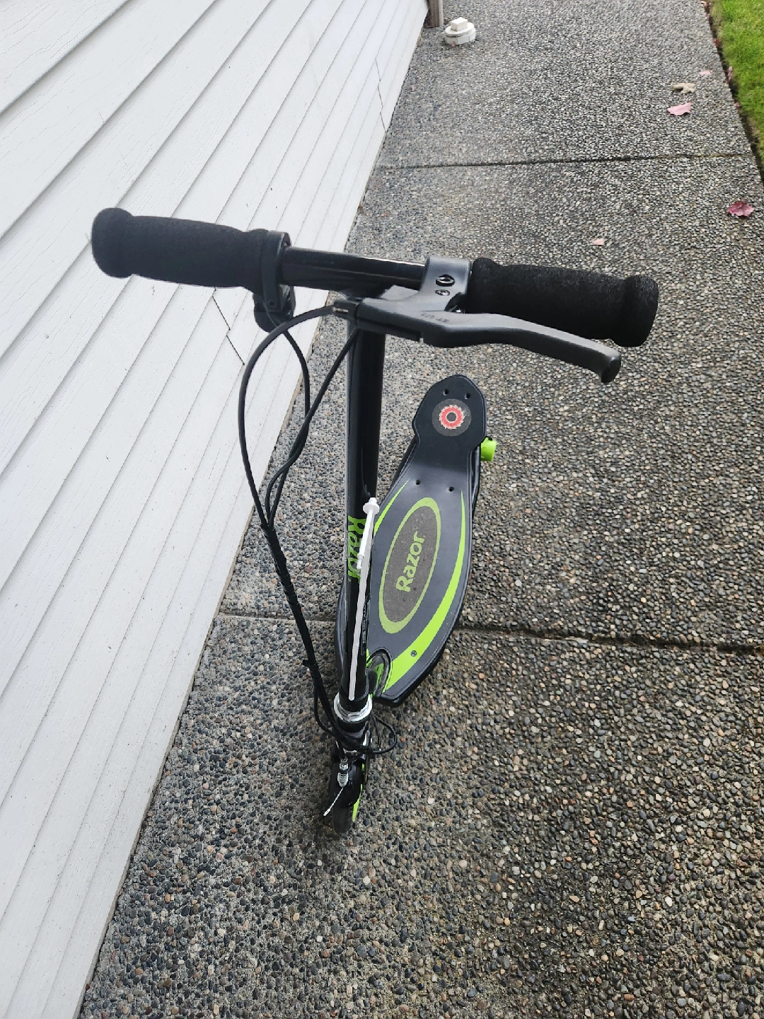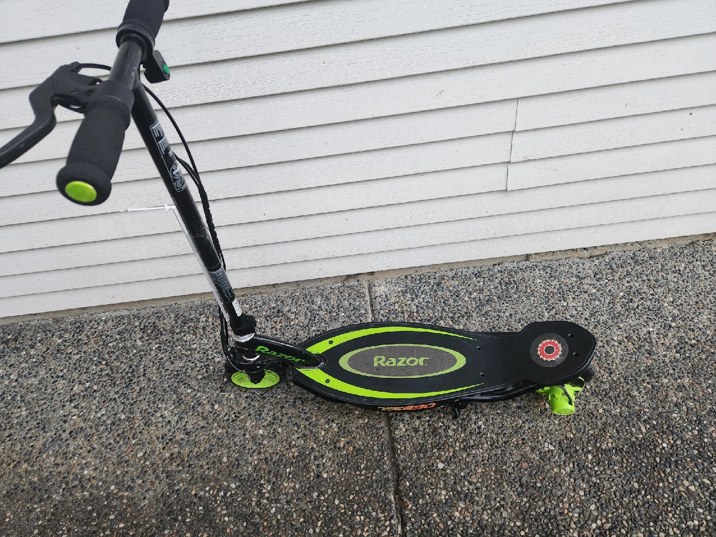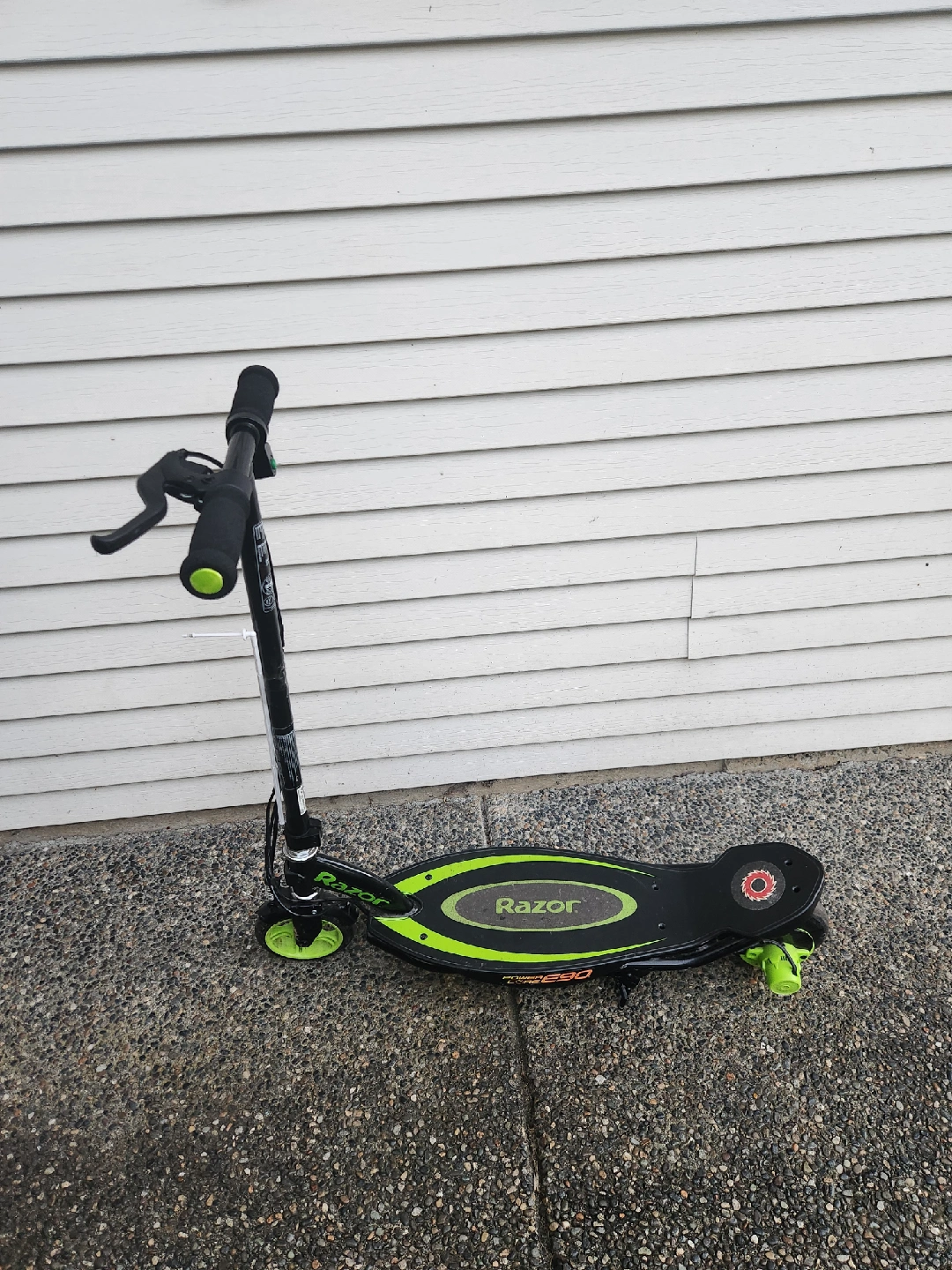 Selling a Razor E90 electric scooter! It's in good shape and ready for some fun rides. The scooter features a sleek black and green design. Perfect for kids looking for a bit of electric-powered adventure!