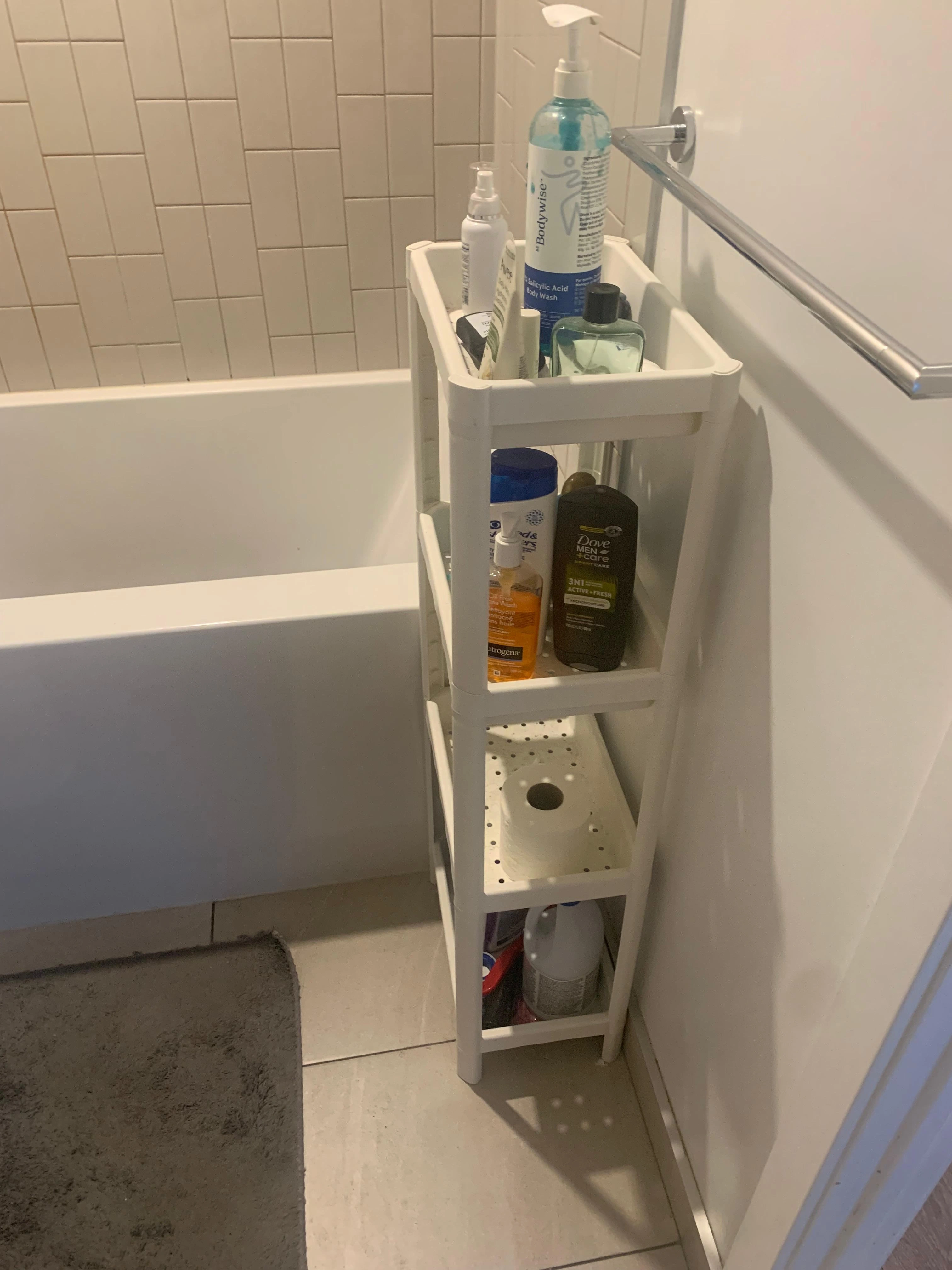 Description: Compact white plastic shelf unit ideal for bathrooms or small spaces.