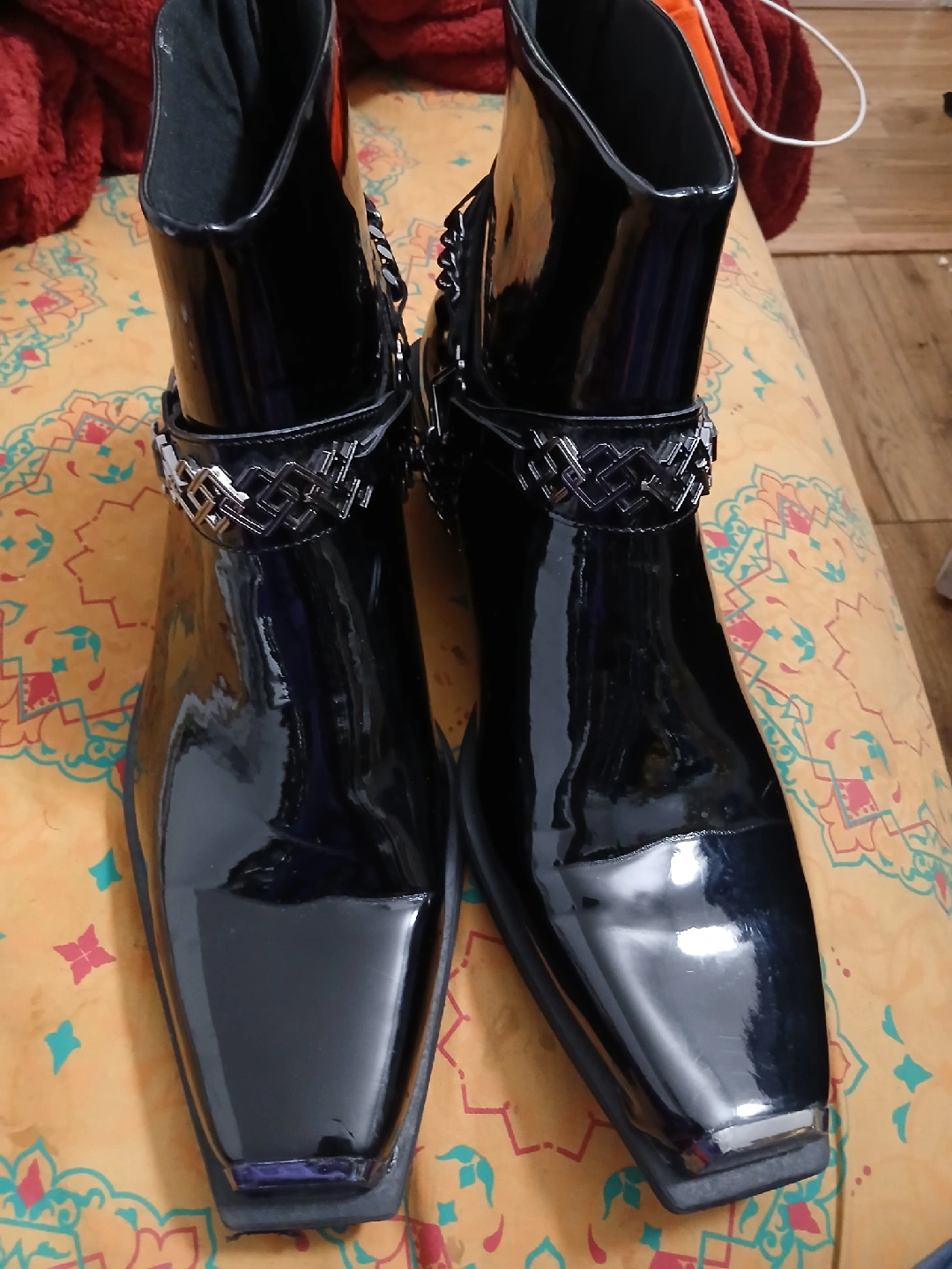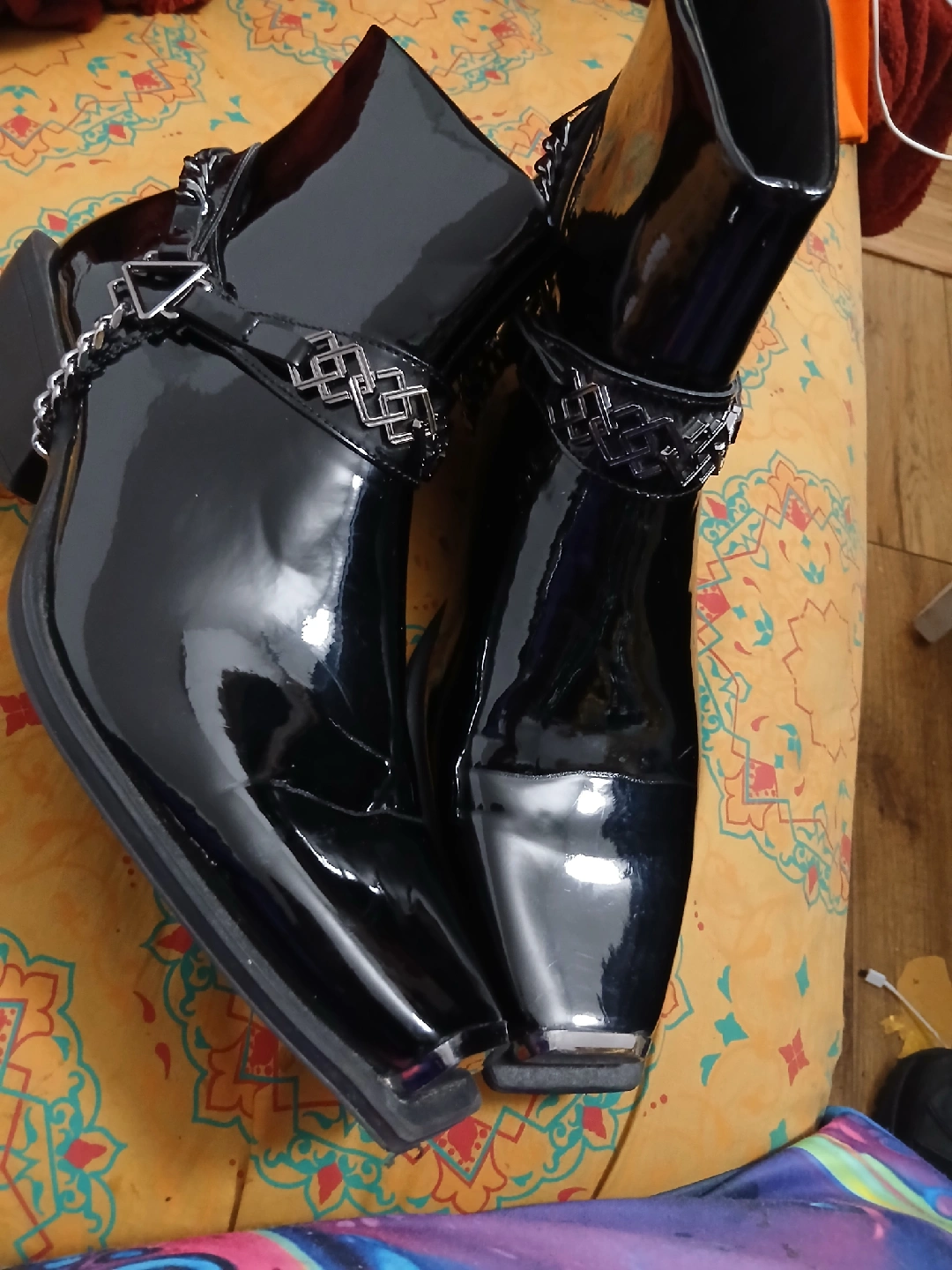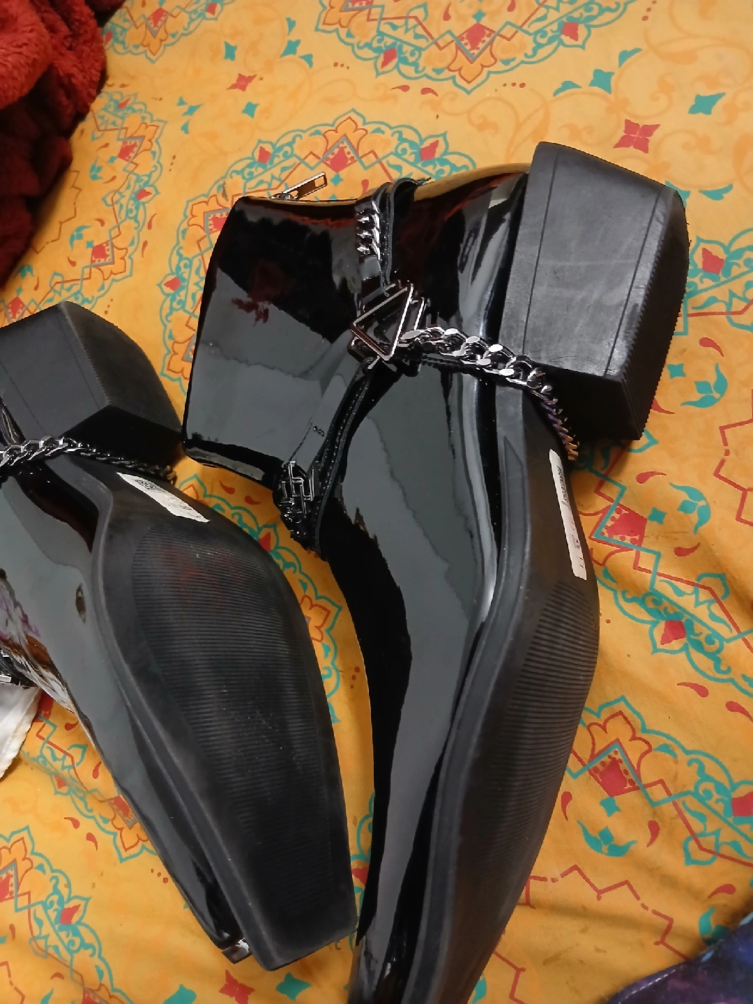 25Selling a pair of black patent leather ankle boots. They have a square toe and a chunky heel. There is a decorative chain and strap detail around the ankle. These boots are in great condition and ready for a new home
