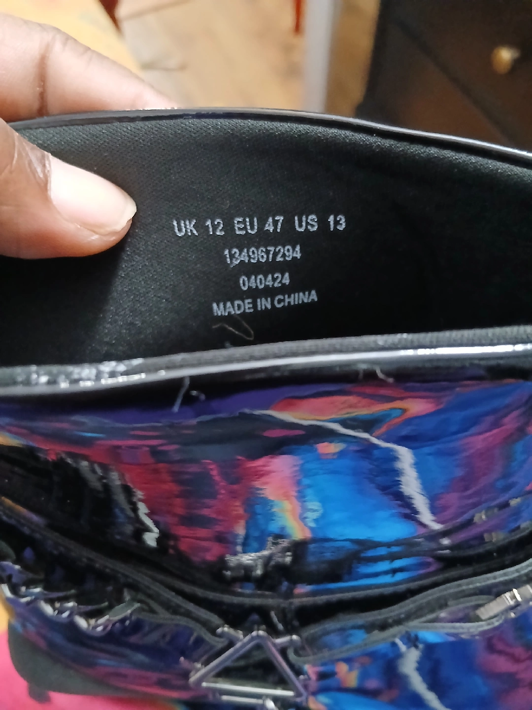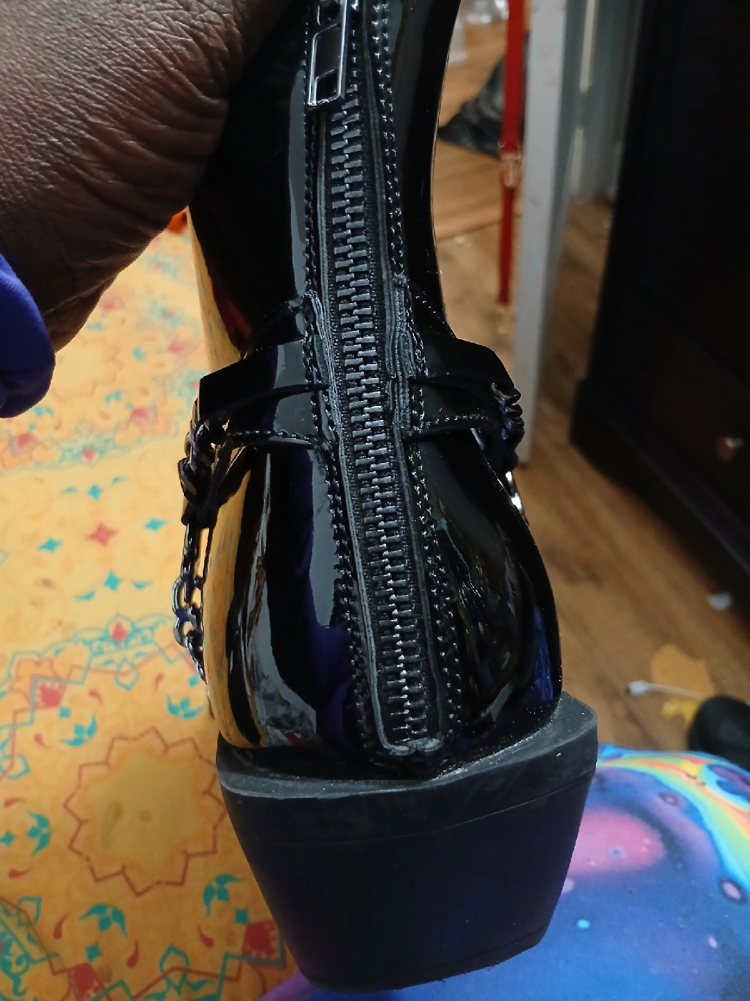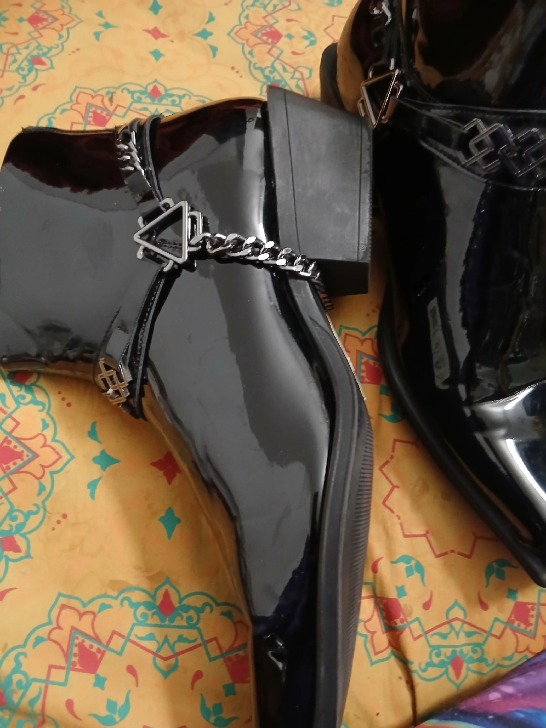 25Selling a pair of black patent leather ankle boots. They have a square toe and a chunky heel. There is a decorative chain and strap detail around the ankle. These boots are in great condition and ready for a new home