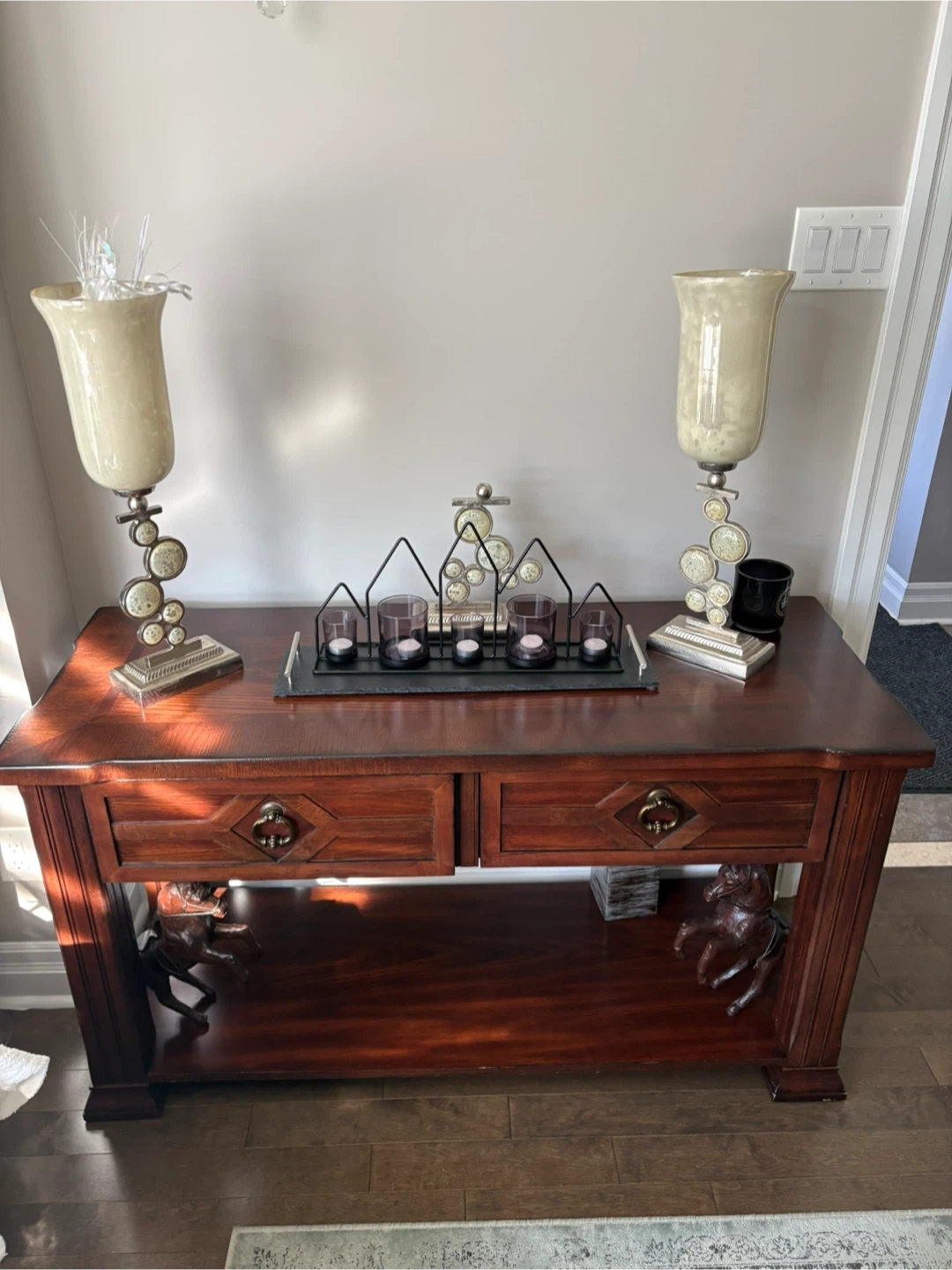 A lovely wooden console table, perfect for an entryway or living room. It features two drawers for storage and a shelf at the bottom. The table has a rich, warm finish and detailed carvings, including horse figures on the legs. A stylish addition to any home!